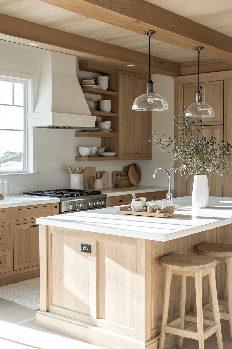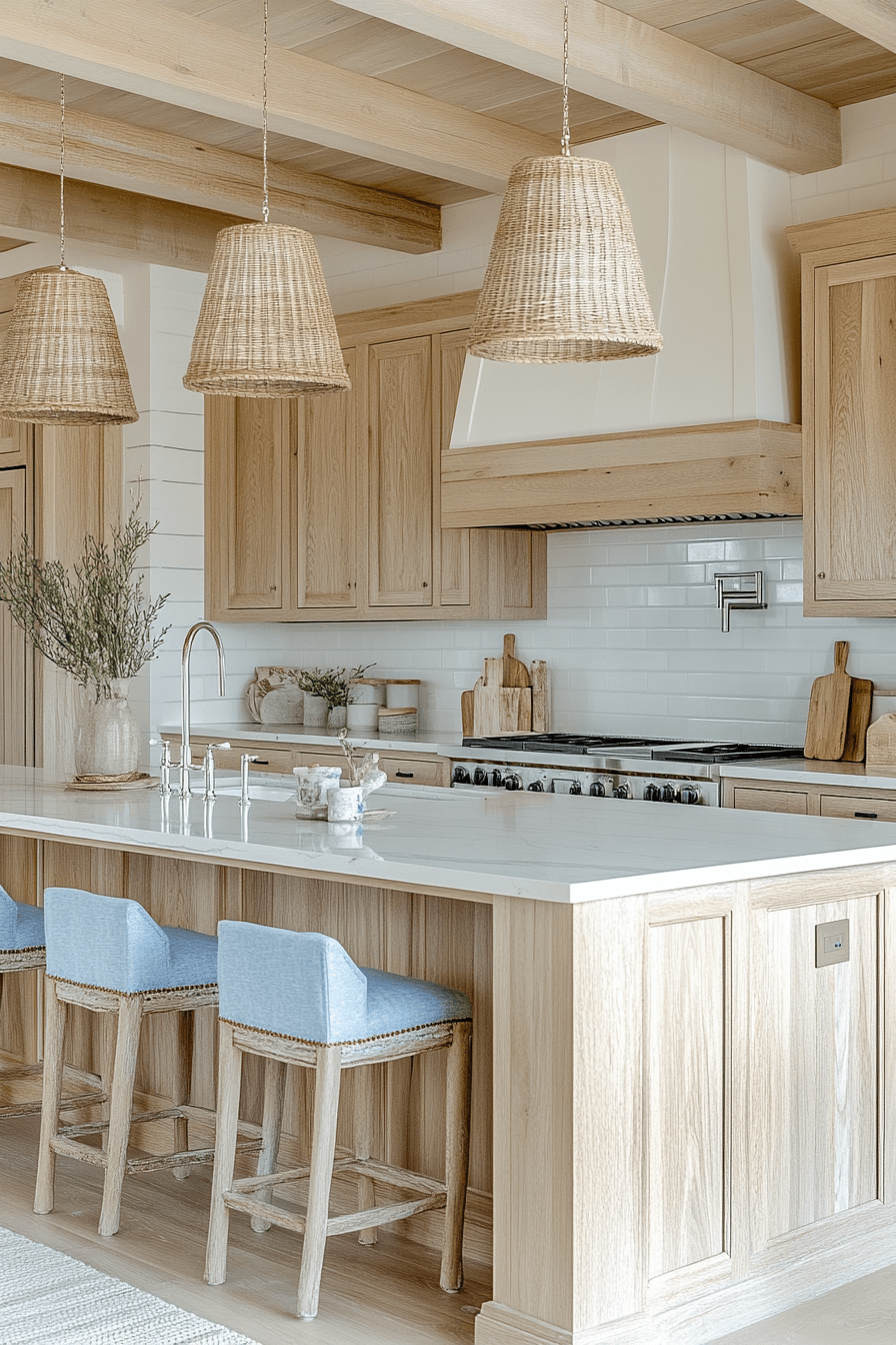 Light oak tones bring a soft warmth that instantly enhances a beach house kitchen without overpowering it. The natural wood pairs beautifully with white walls and subtle hints of blue for a balanced look. These tones echo sandy boardwalks and driftwood, creating a strong coastal connection. The result feels modern, inviting, and easy to live in every day. It’s a great way to introduce texture while keeping the space light and fresh. Add this warm wood element and refresh your kitchen style.