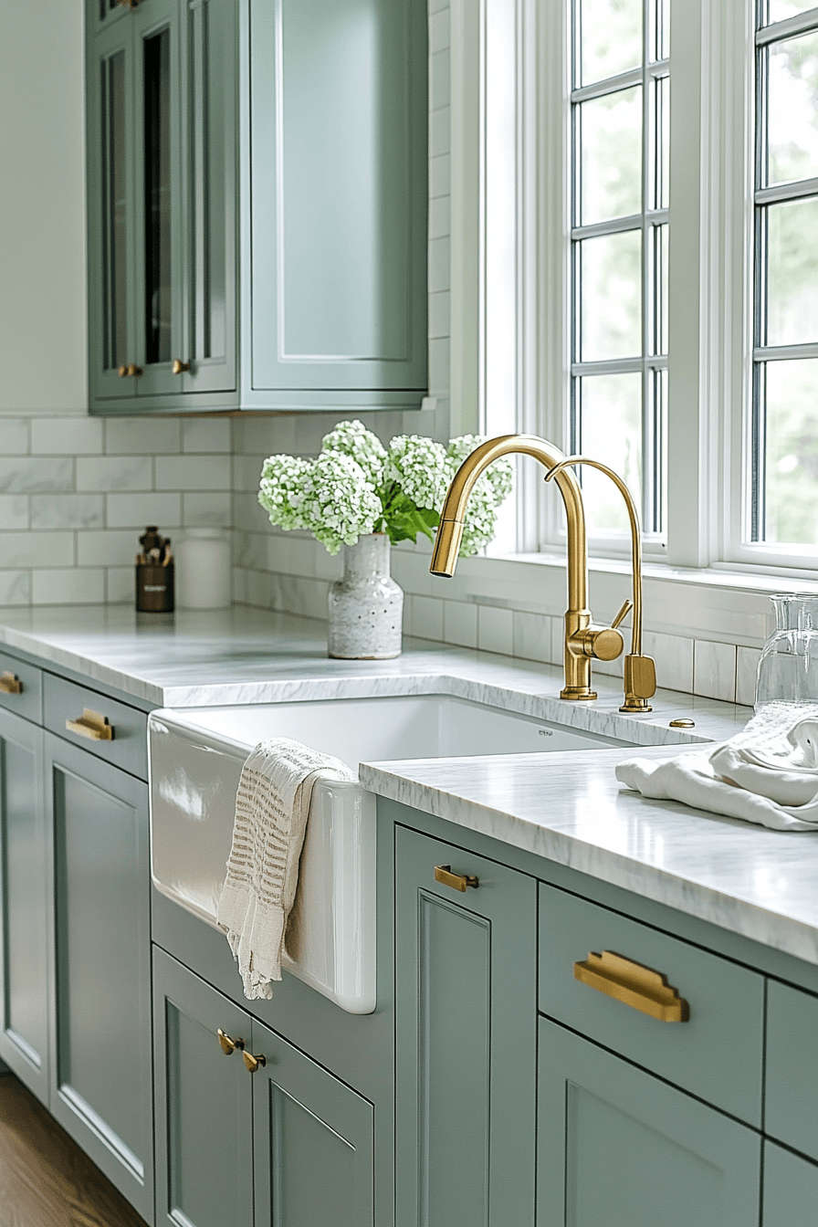 Soft seafoam hues introduce a gentle pop of color that feels perfect for a beach house kitchen. Muted green-blue cabinetry adds personality while still keeping the space calm and refined. When combined with marble surfaces and warm metallic accents, the design feels elevated yet relaxed. The color subtly reflects the ocean, tying everything back to a coastal theme. It’s a playful but sophisticated way to add interest without overwhelming the room. Bring this fresh color palette into your kitchen and enjoy a coastal upgrade.