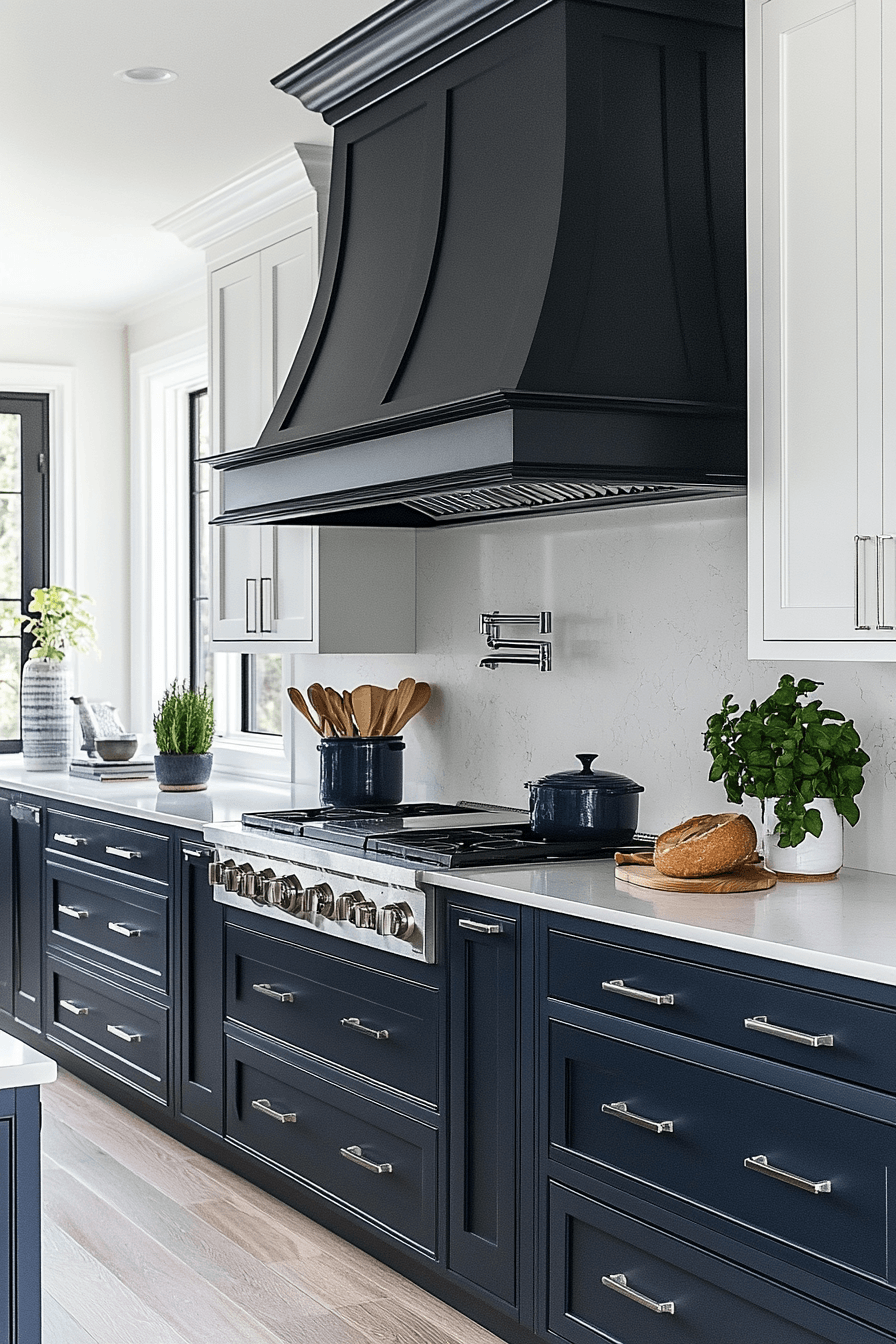 A modern take on nautical style brings a crisp, updated feel to a beach house kitchen without leaning too traditional. Deep navy base cabinets paired with bright white uppers create a bold contrast that still feels balanced and clean. Sleek hardware and simple lighting keep the overall look fresh rather than overly themed. This color pairing feels both timeless and current, making it easy to love for years. It captures coastal charm while staying polished and modern. Bring this refined maritime vibe into your kitchen and refresh your space.