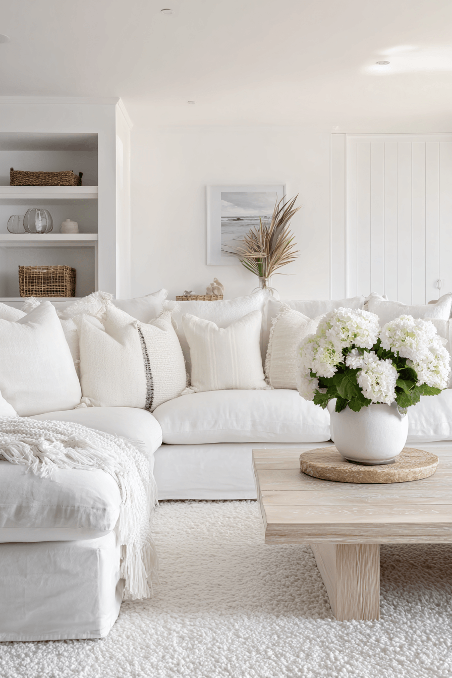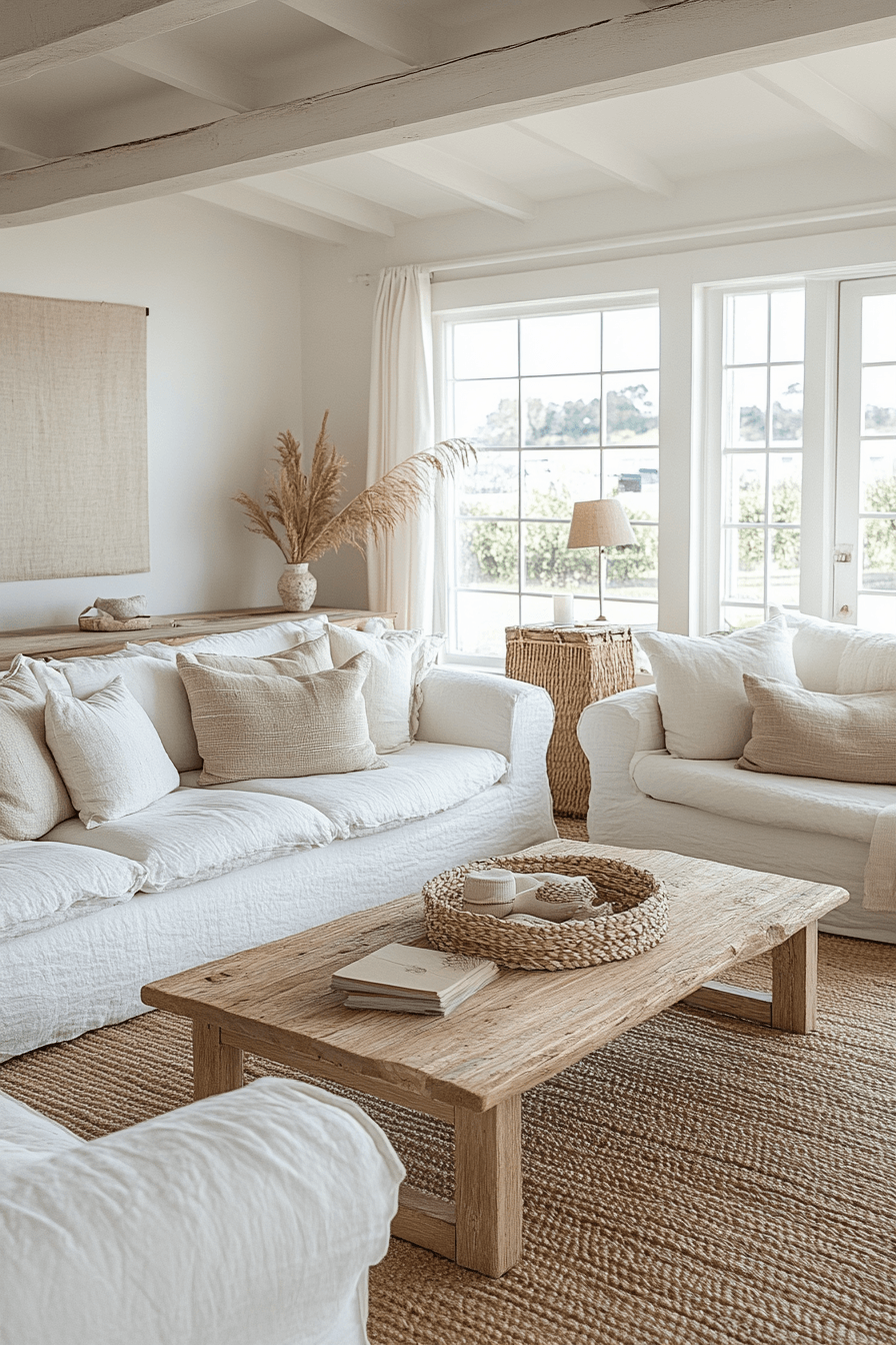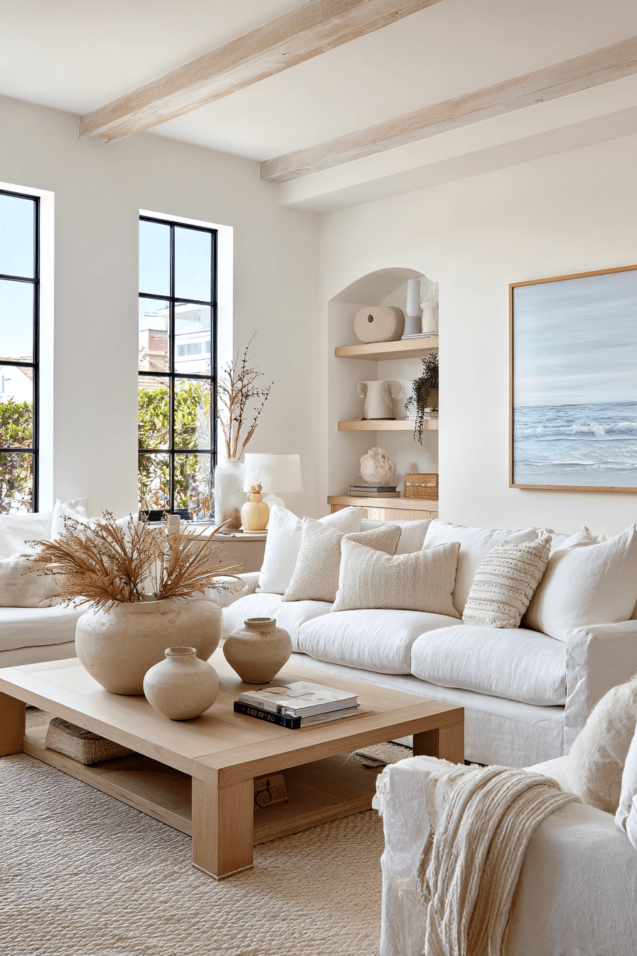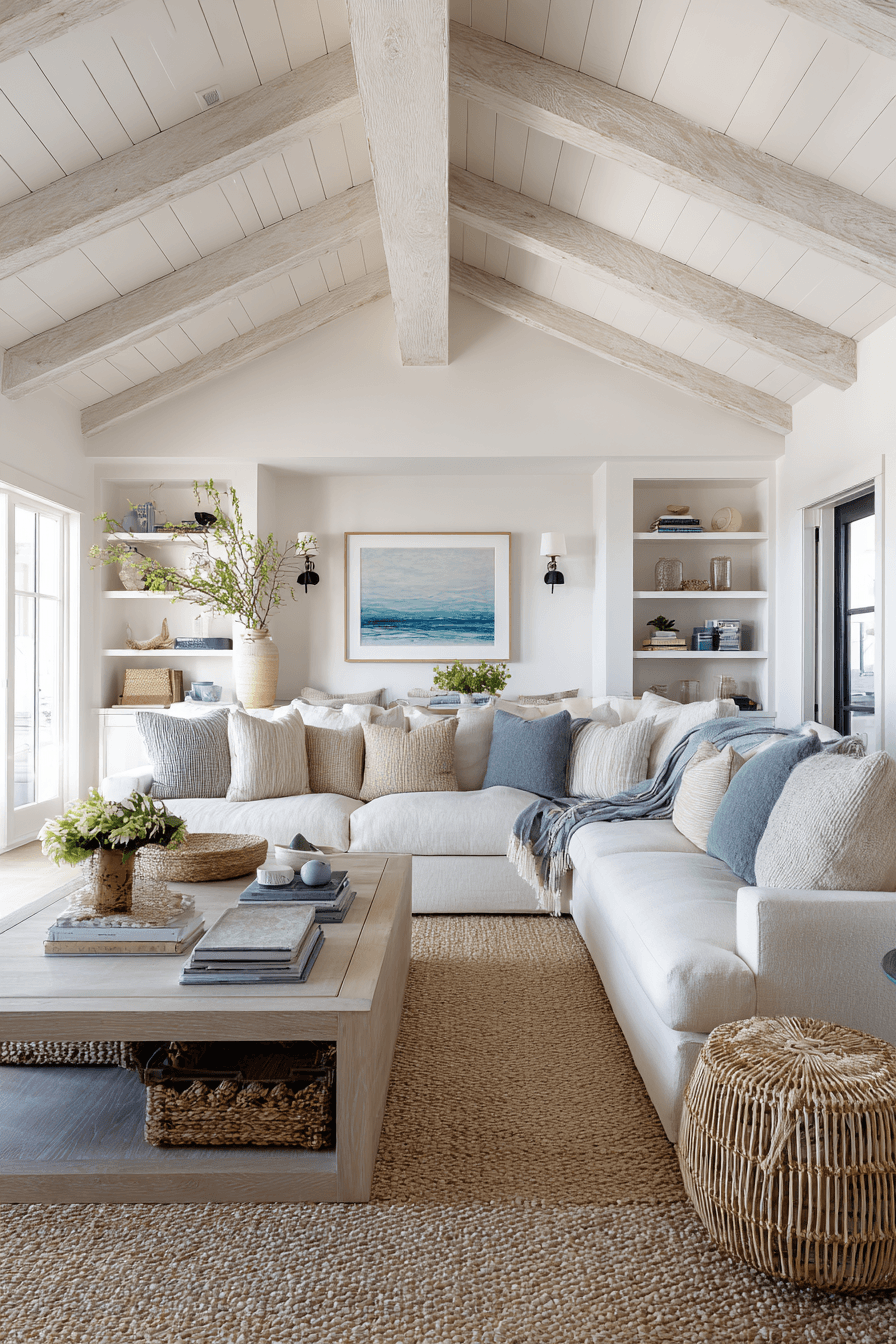 Layered neutrals create a timeless and versatile look that works beautifully in a beach house living room. Shades of white, cream, taupe, and soft sand tones provide a calm and cohesive foundation. The simplicity of the palette allows textures like woven rugs and soft upholstery to stand out. Subtle coastal accents add personality while keeping the space uncluttered. In a beach house living room, this approach keeps things feeling sophisticated yet relaxed all year long. Refresh your space with these easy, elegant neutral layers.