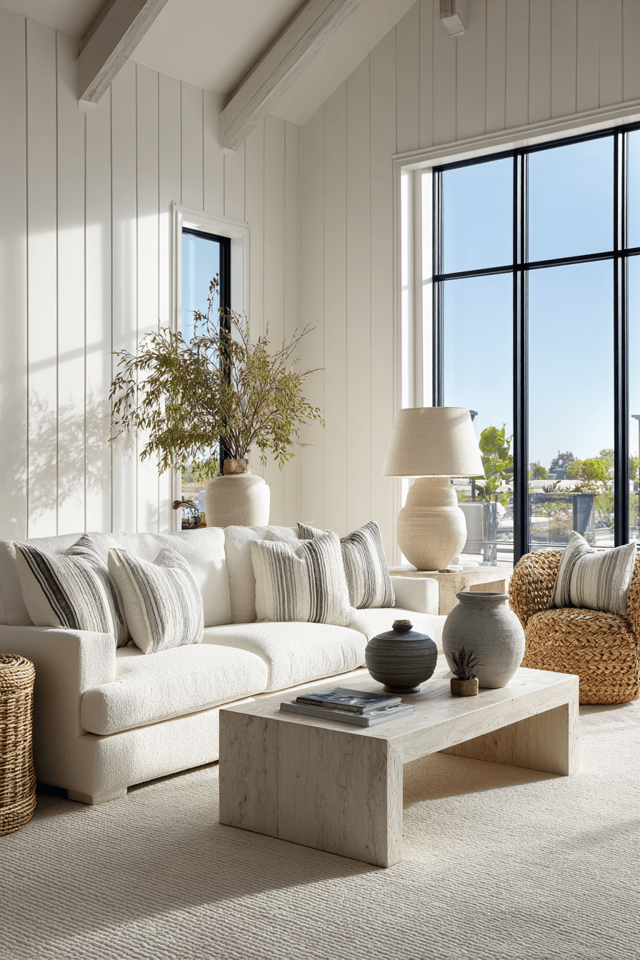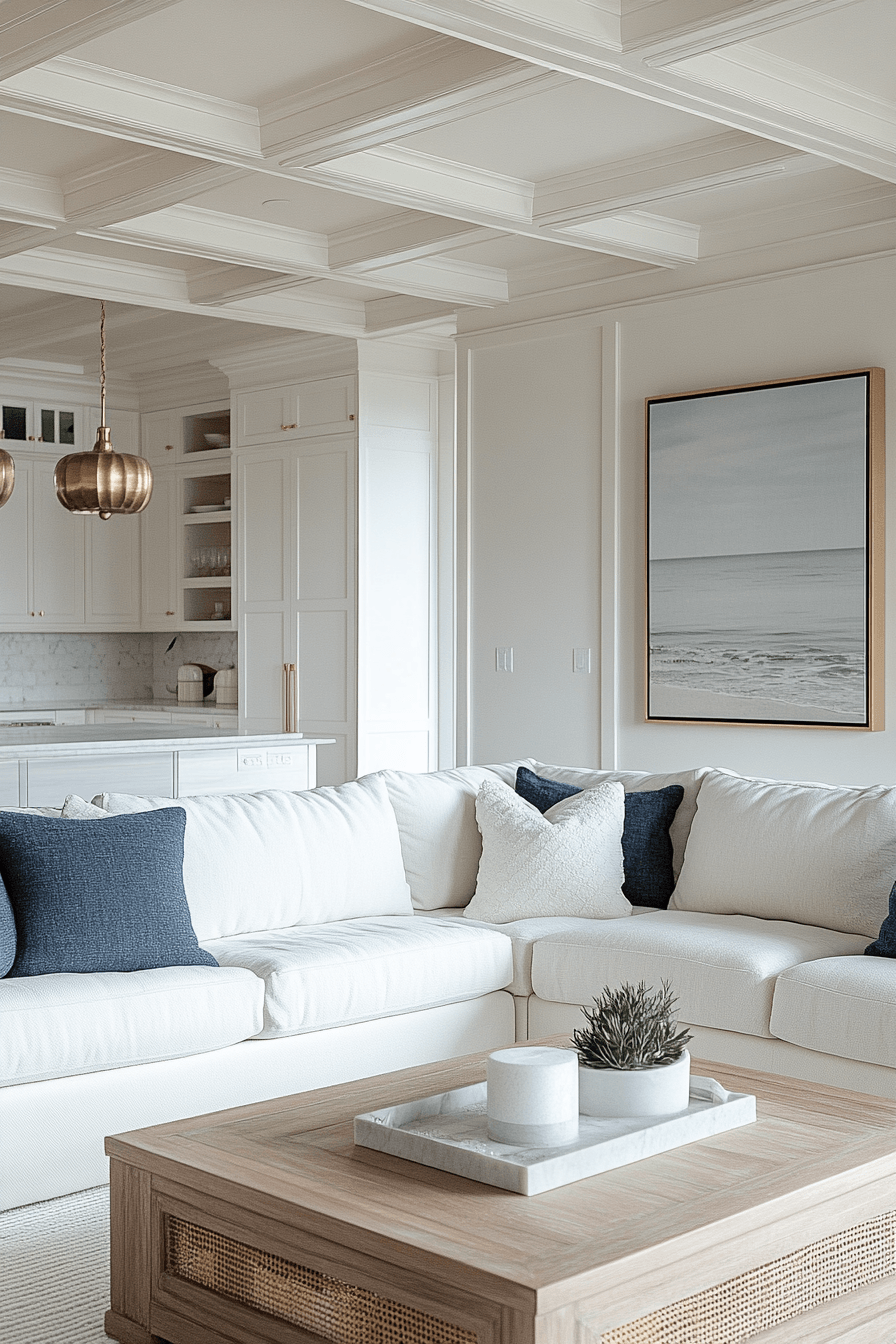 A crisp and clean design adds structure to a beach house living room while still keeping it relaxed. White upholstery, subtle stripes, and simple furniture lines help the space feel organized without heaviness. The streamlined look prevents clutter and keeps everything visually light. This works well because it blends modern style with easy coastal comfort. In a beach house living room, this balance creates a space that feels fresh and inviting. Refresh your space with this clean coastal approach and enjoy the simplicity.