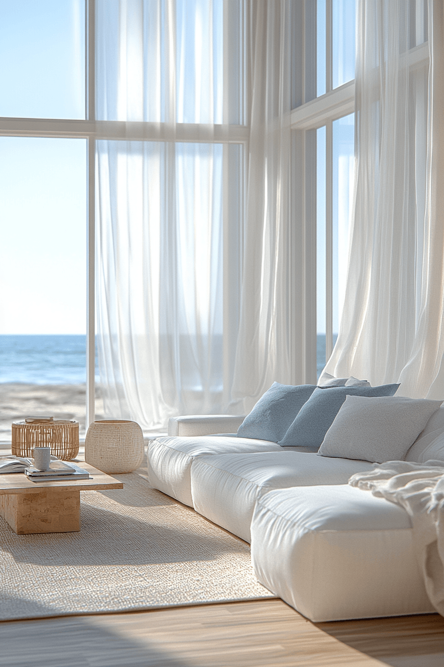 An airy, light-filled space sets the tone for a relaxing beach house living room that feels open and effortless. Soft white walls, oversized linen sofas, and sheer curtains help sunlight move freely throughout the room. The layout stays simple and uncluttered, echoing the calm and expansive feeling of the ocean nearby. Light wood finishes and woven accents add just enough warmth without making the space feel heavy. This approach works beautifully in a beach house living room because it captures that easy, breezy coastal vibe. Bring this fresh, open look into your home and enjoy a brighter everyday space.