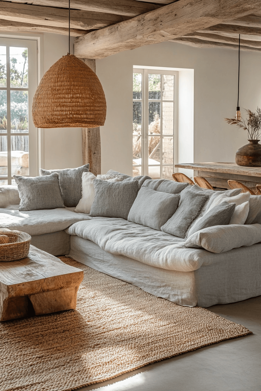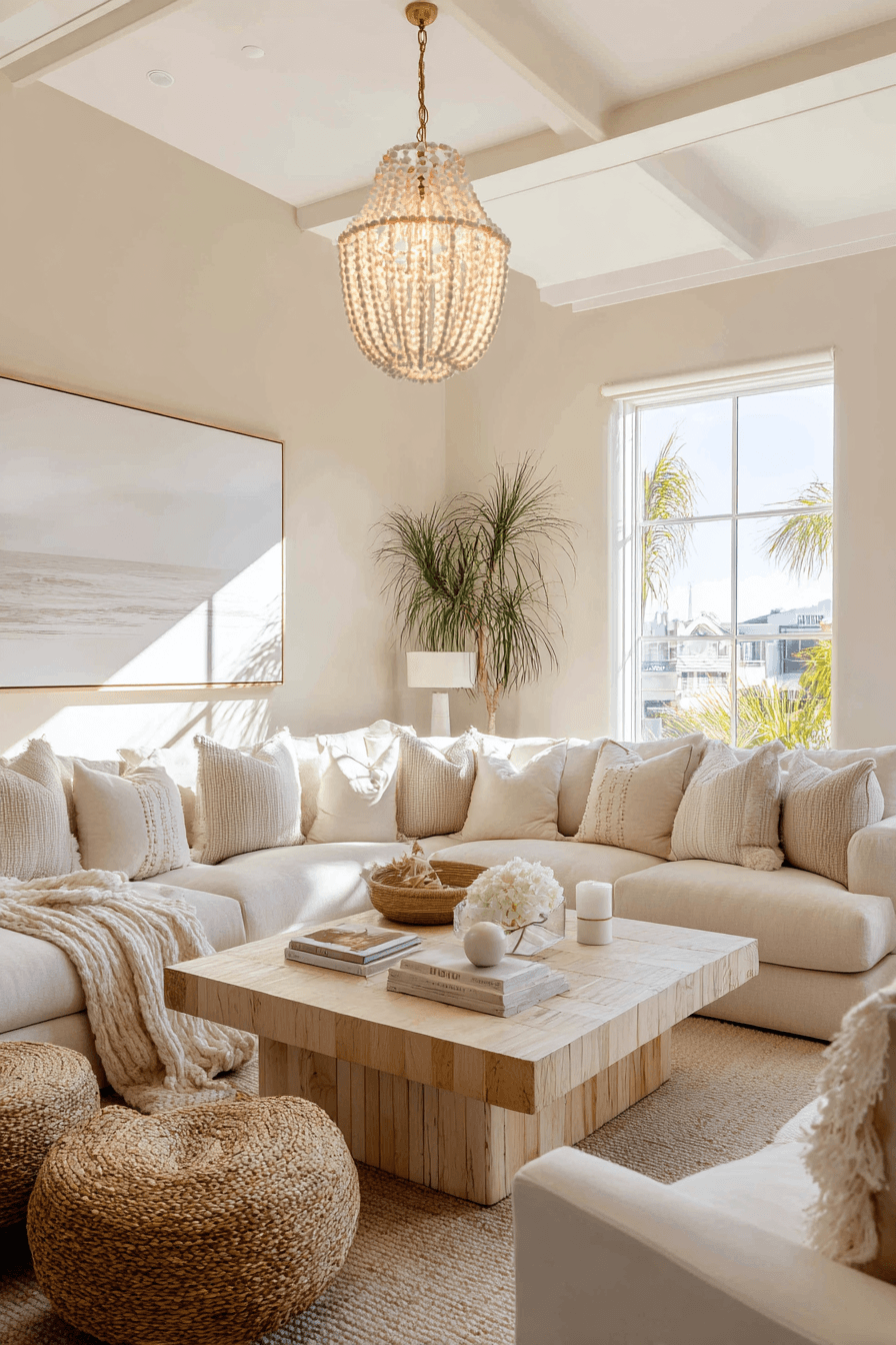 A polished yet relaxed setup brings a refined touch to a beach house living room without losing its casual charm. Sleek tables, statement lighting, and layered neutral tones create visual interest in a subtle way. This style works because it blends sophistication with the easygoing nature of coastal living. Comfortable seating keeps the space practical and inviting for everyday use. A beach house living room designed like this feels elevated but still completely livable. Try this balanced approach and upgrade your coastal style.