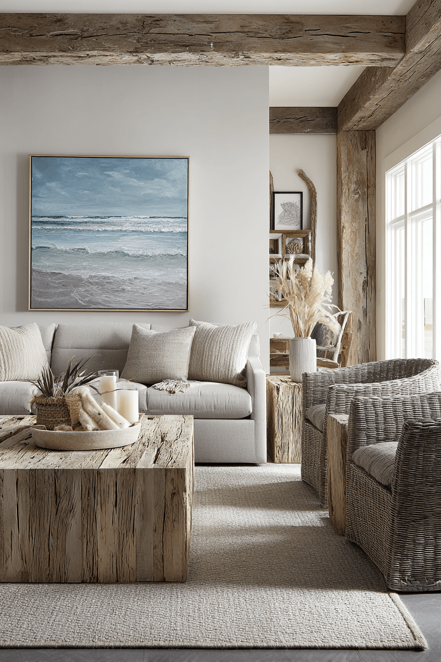 Natural textures and weathered wood bring an organic feel to a beach house living room without making it look overly rustic. Soft gray-brown tones inspired by driftwood add depth and character to the space. When paired with clean lines and modern furniture, the overall look stays fresh and contemporary. This balance of natural elements and simplicity keeps the design grounded yet elevated. A beach house living room styled this way feels connected to the outdoors while still polished. Add these wood-inspired details and refresh your coastal space.
