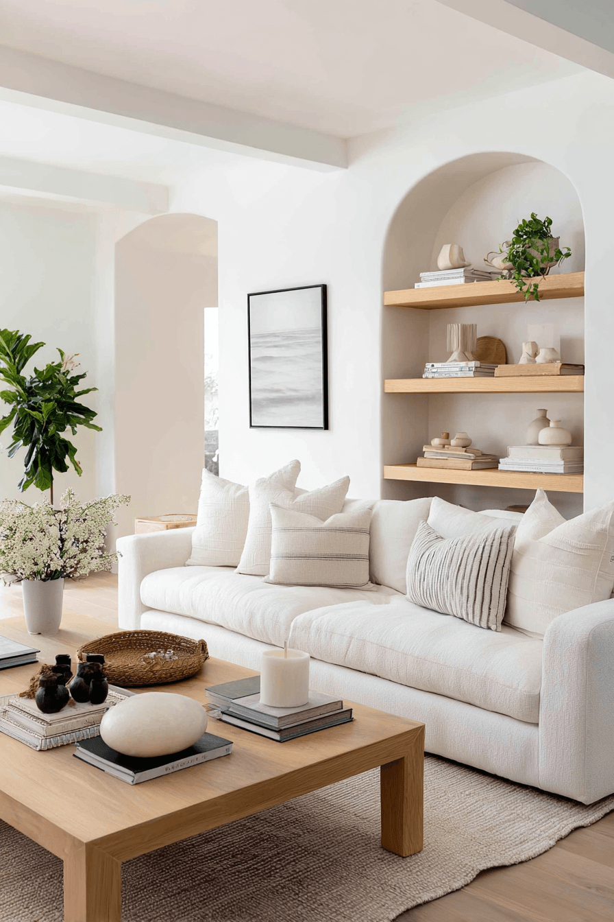 Soft shell-inspired hues offer a fresh twist on traditional coastal style in a beach house living room. Shades of blush, ivory, and taupe create a warm and refined palette that feels both modern and subtle. Paired with clean-lined furniture, the overall look feels current and elevated. This approach works because it draws inspiration from the coast without relying on obvious themes. A beach house living room styled this way feels balanced, calming, and quietly sophisticated. Introduce these soft tones and give your space a modern coastal refresh.
