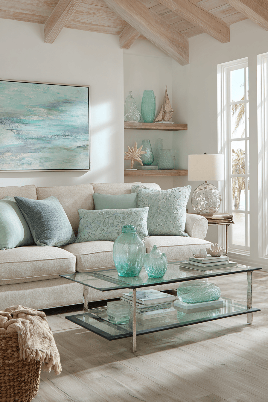 Soft sea glass tones introduce a refreshing mix of aqua, pale blue, and muted green into a beach house living room. These colors feel light and uplifting while still blending beautifully with a neutral base. Paired with white walls and subtle metallic accents, the overall look stays clean and modern. This palette works because it reflects the shimmer and movement of ocean water in a subtle way. A beach house living room styled with these hues feels cool, bright, and full of life. Add these ocean-inspired colors and give your space a fresh update.