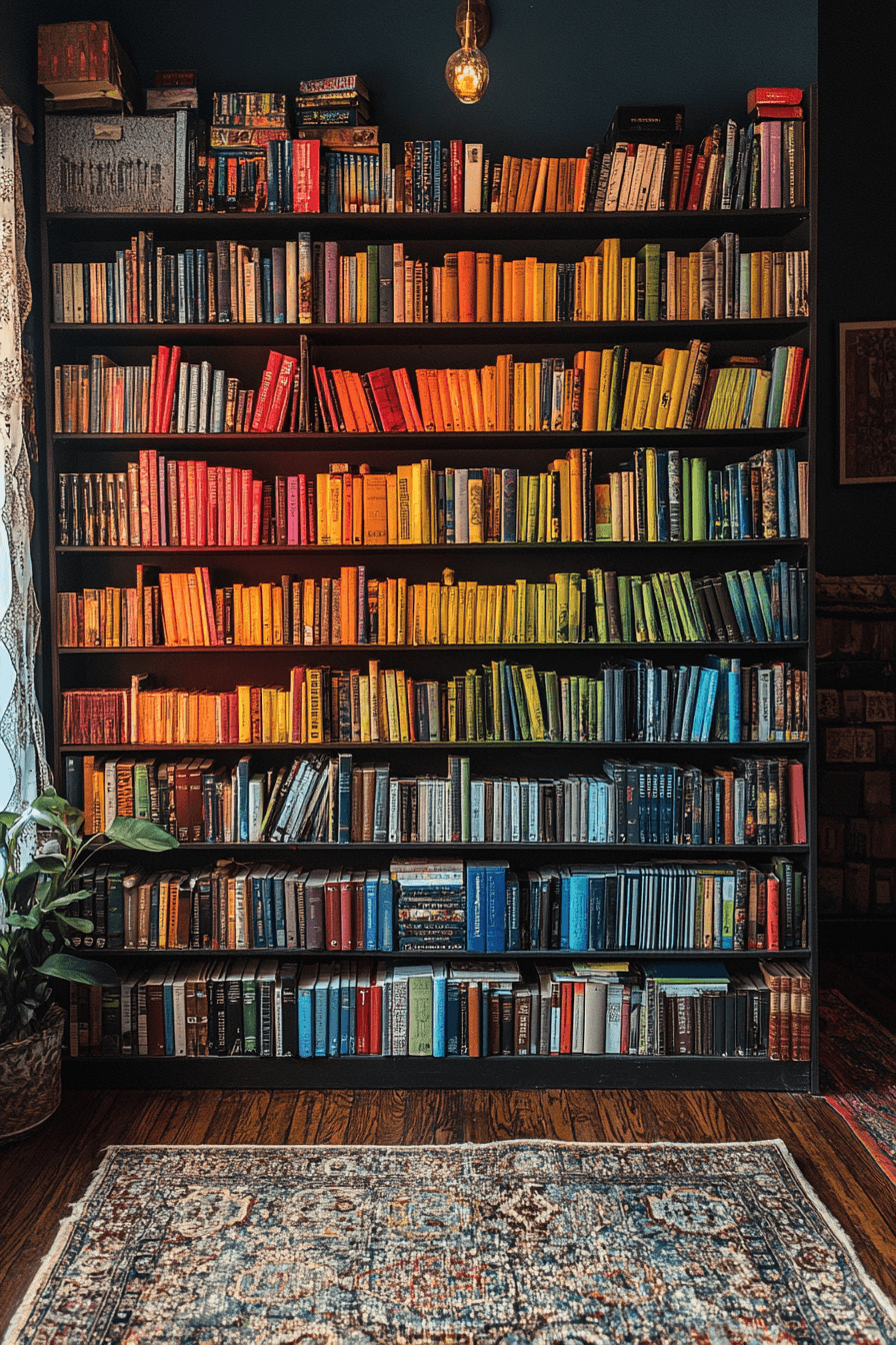 Color-block shelving adds a playful punch of personality to your collection. These bookshelf ideas group books by color, turning your shelf into a visual rainbow. It’s an easy styling trick that makes a huge impact. Whether you use bold brights or soothing pastels, the effect is always joyful. Design-forward and surprisingly organized.