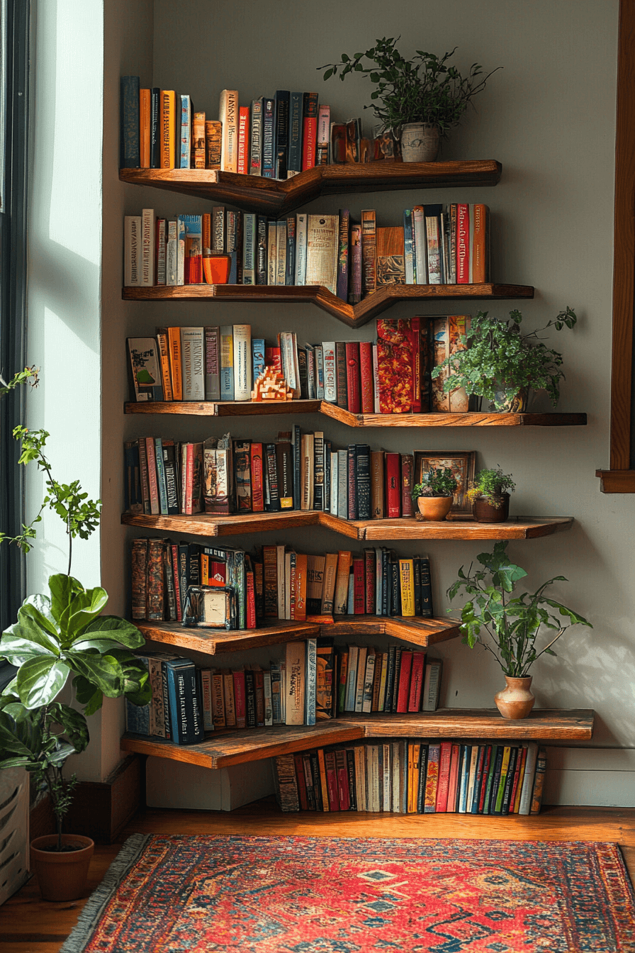 Corner wraparound shelves are smart bookshelf ideas that make every inch of space count. Designed to fit snugly into corners, they turn unused spots into beautiful book displays. Perfect for small rooms or awkward layouts, these shelves maximize storage while looking modern and intentional. Style them with books, vases, or photos for a truly personalized touch. Form meets function in the most space-savvy way.