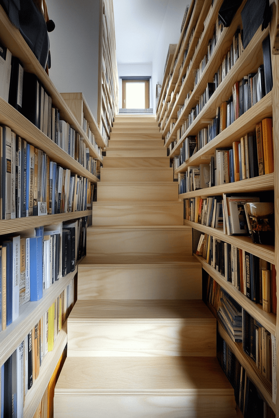 Stair-integrated shelving brings innovative charm to compact homes with bookshelf ideas that feel totally seamless. These designs tuck neatly into each riser or sidewall, making the staircase a multi-functional feature. It’s an unexpected and clever way to maximize vertical space. Books become part of the architecture—practical and beautiful all at once. Great for narrow layouts or loft-style living.