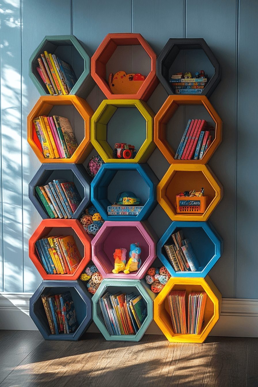 Honeycomb shelves add playful geometry to your walls, making them one of the most delightful bookshelf ideas. The hexagonal pattern feels fresh and dynamic, perfect for creative or eclectic spaces. Arrange them in clusters or scatter them for a custom layout that fits your vibe. Great for storing books, plants, or decor with flair. These shelves are as fun as they are functional.