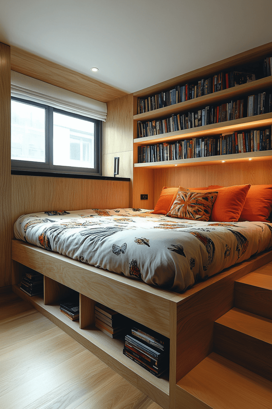 Under-bed shelving transforms overlooked space into practical storage with stylish results. These bookshelf ideas slide easily under the bed or integrate into built-in platforms. They’re perfect for tight bedrooms, dorms, or minimalist layouts. Keep your favorites close while maintaining a clean, open vibe. It’s smart design that keeps clutter out of sight.