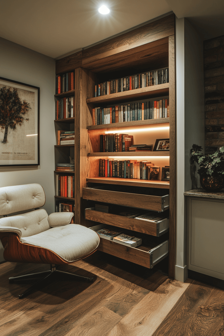 Pull-out shelving brings innovation and motion to your book storage with clever slide-out functionality. These bookshelf ideas are perfect for hidden nooks, kitchen pantries, or under-the-stairs surprises. Books stay protected and organized, yet completely accessible. It’s sleek, fun, and perfect for small or modern spaces. Function meets flair with every slide.