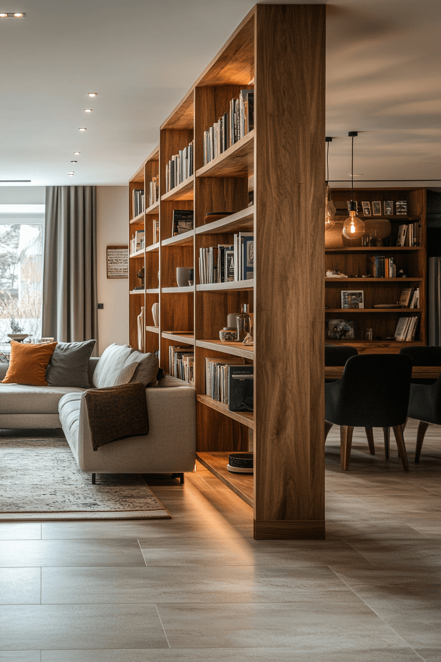 Double-sided bookcases offer flexibility and style, making them one of the most versatile bookshelf ideas for open spaces. With shelves on both sides, they’re ideal for use as room dividers or central features in large layouts. They provide tons of storage without breaking the visual flow. Light still travels through, keeping everything bright and connected. It’s structure with an open mind.