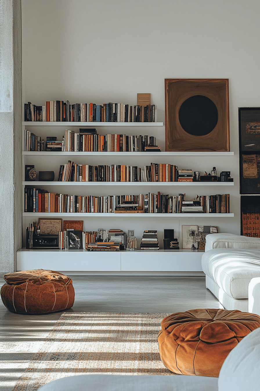 Floating shelves bring modern flair and a clean finish, making them standout bookshelf ideas for minimalist lovers. With hidden supports, they appear to float, giving your wall a sleek and airy vibe. Perfect for small spaces, they offer both function and visual lightness. You can mix books with art pieces for a curated, gallery-like look. The minimal design lets everything else shine.