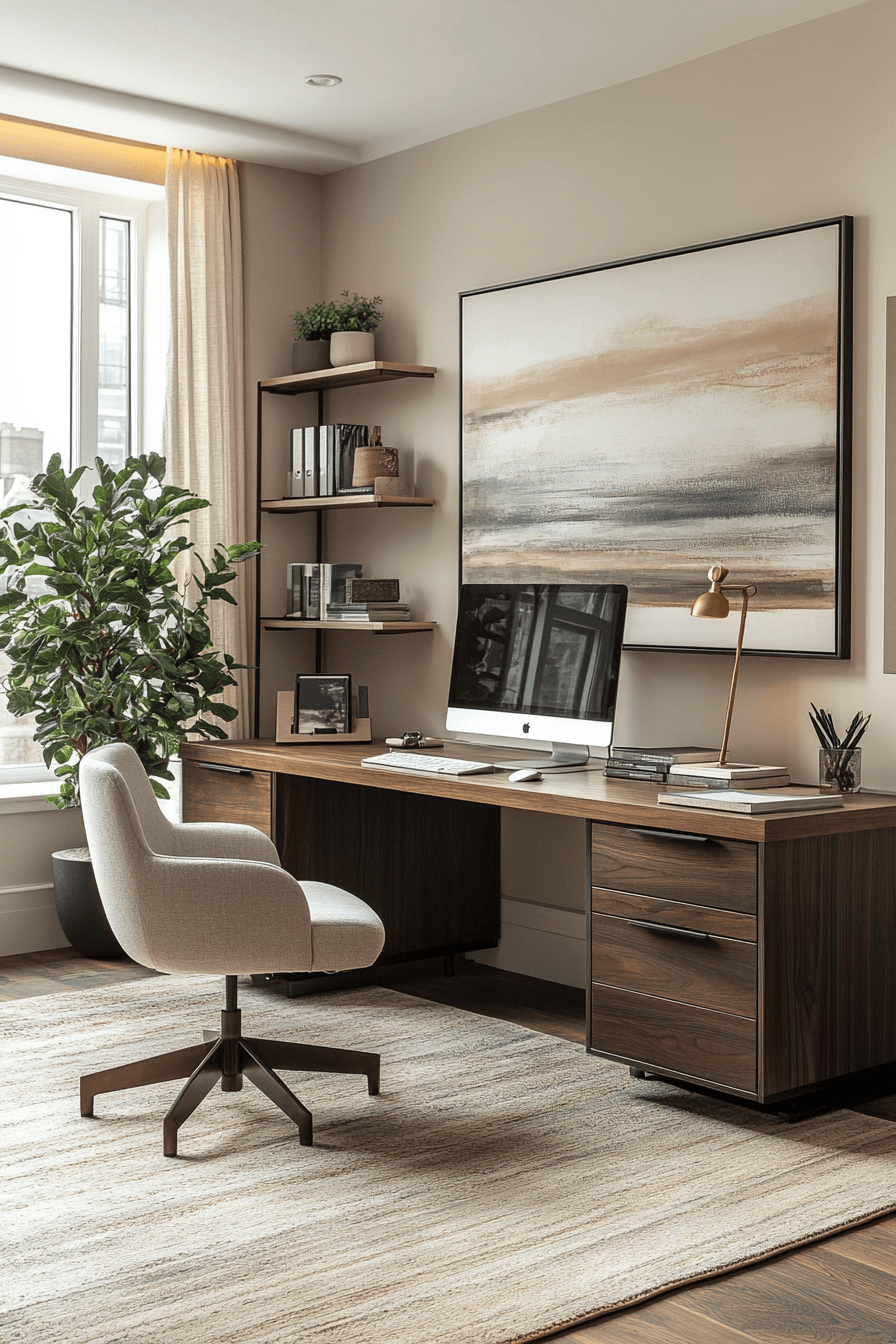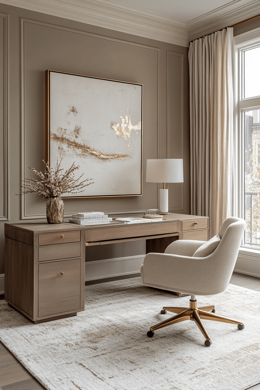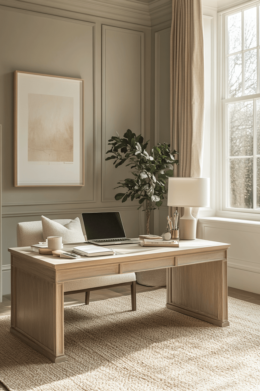 A subdued style workspace focuses on quiet tones and minimal details for calming office decor that feels effortlessly composed and easy on the mind. Muted colors like soft taupe, dusty grey, and warm beige create a gentle visual backdrop that reduces overstimulation. The layout stays simple and distraction-free, with only essential tools placed neatly within reach. Natural materials like light wood, linen, and matte ceramics introduce subtle warmth without drawing attention. Clean surfaces and hidden storage help maintain the understated aesthetic throughout the day. The mood feels calm, steady, and perfectly suited for focused, uninterrupted work. Click to see more understated office styles.