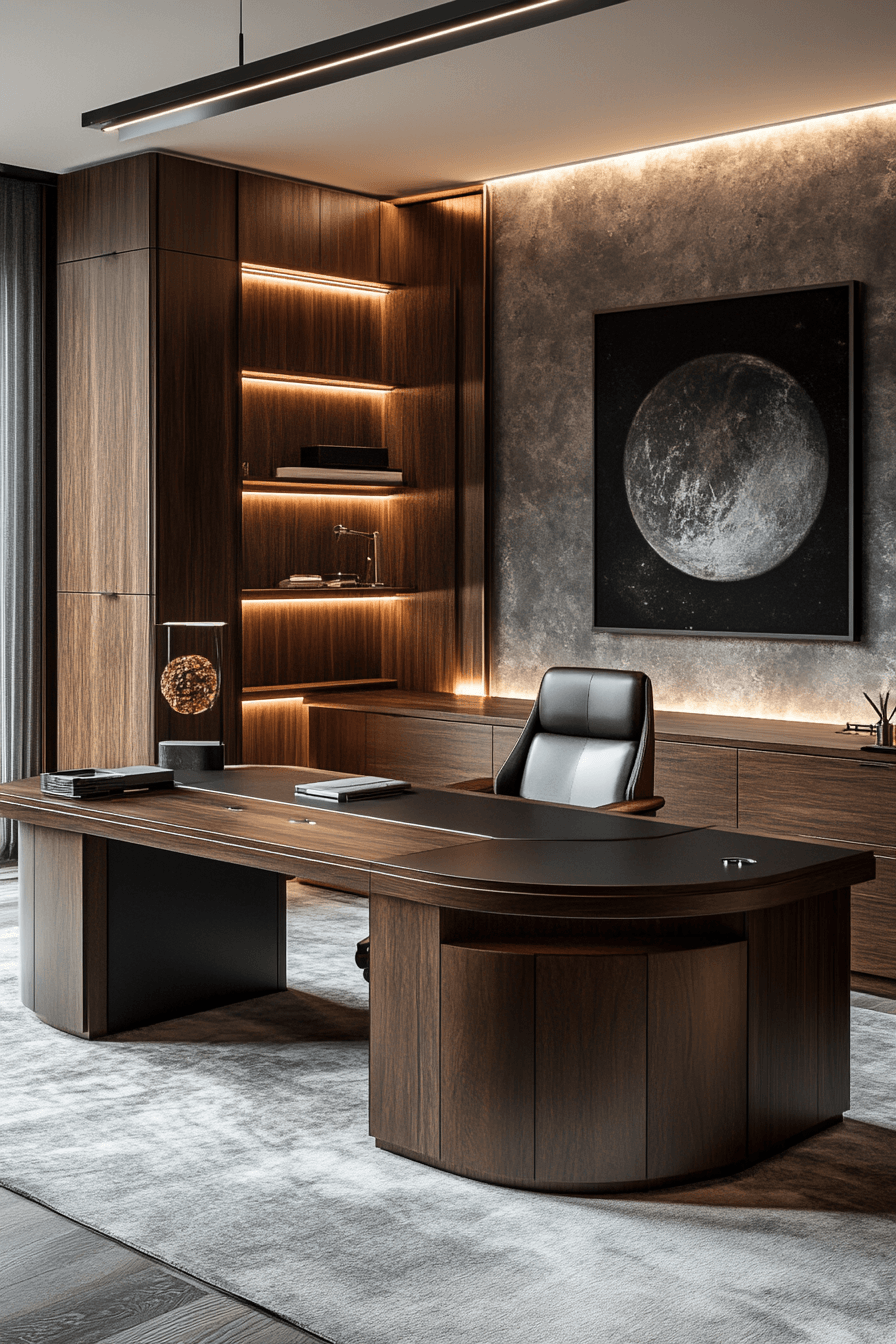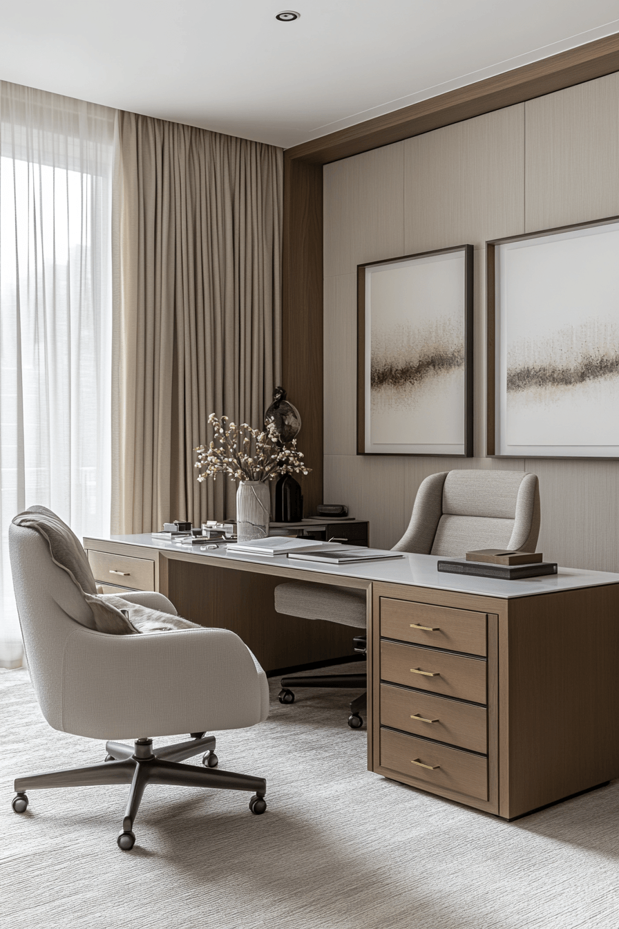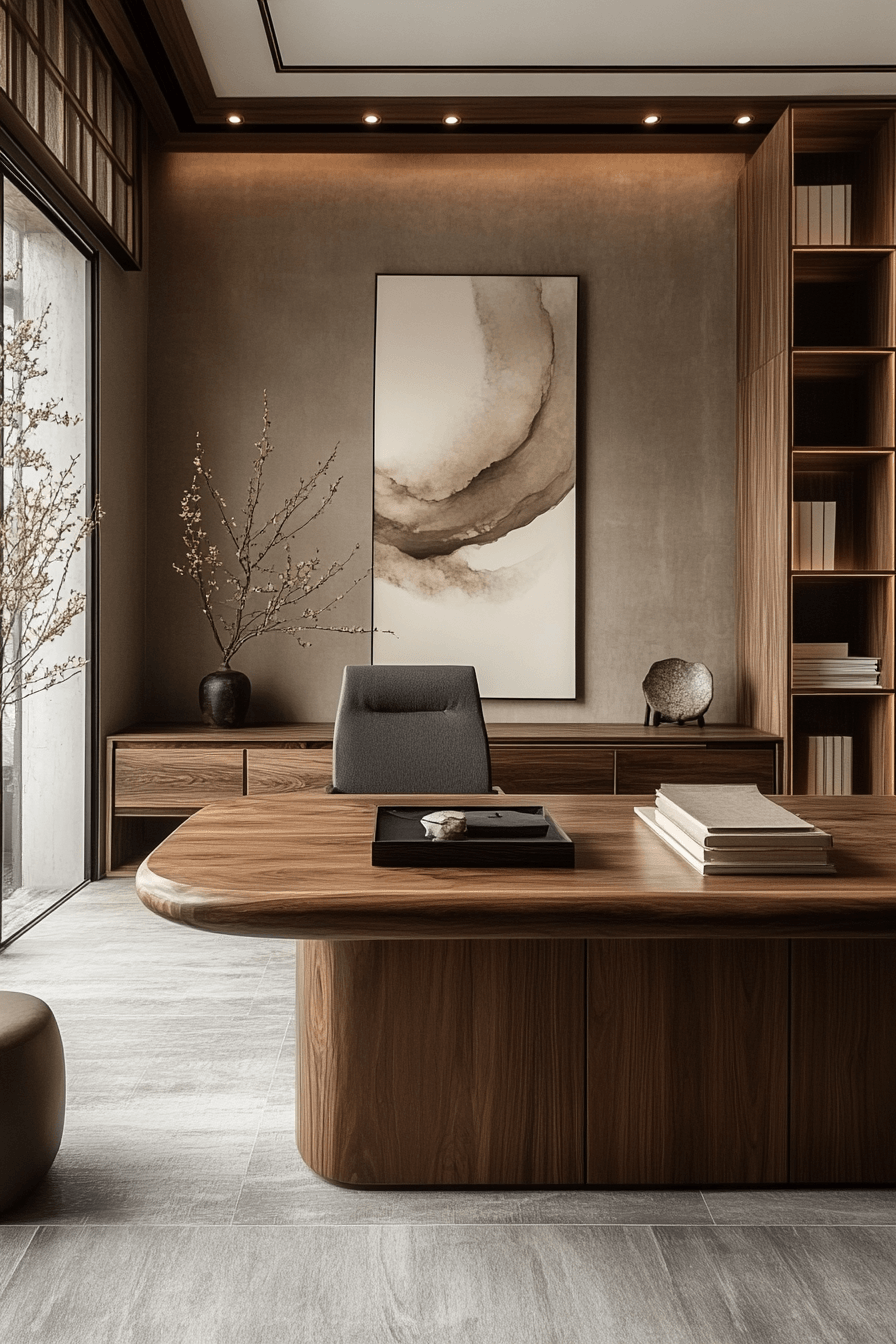 Calm executive suite proves that professional spaces can still embrace calming office decor while maintaining a polished, high-end feel. Sleek furniture paired with soft neutral tones creates a refined yet relaxed environment. The layout is structured and organized, with clear zones for work, storage, and meetings. Materials like wood, leather, and matte finishes add depth and sophistication without feeling heavy. Subtle decor elements keep the space visually interesting while maintaining simplicity. The mood feels confident, composed, and stress-free. Click to view more refined office ideas.
