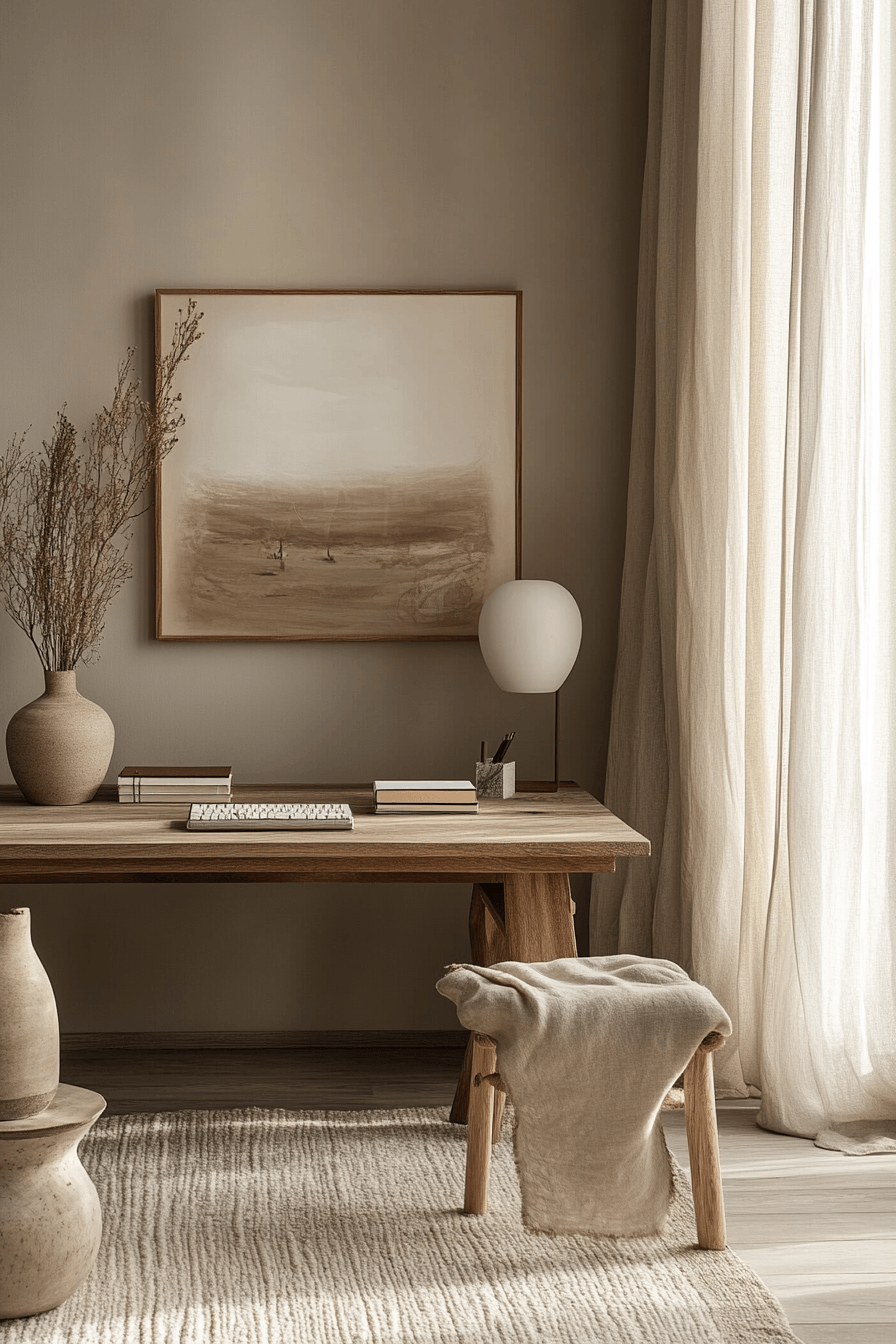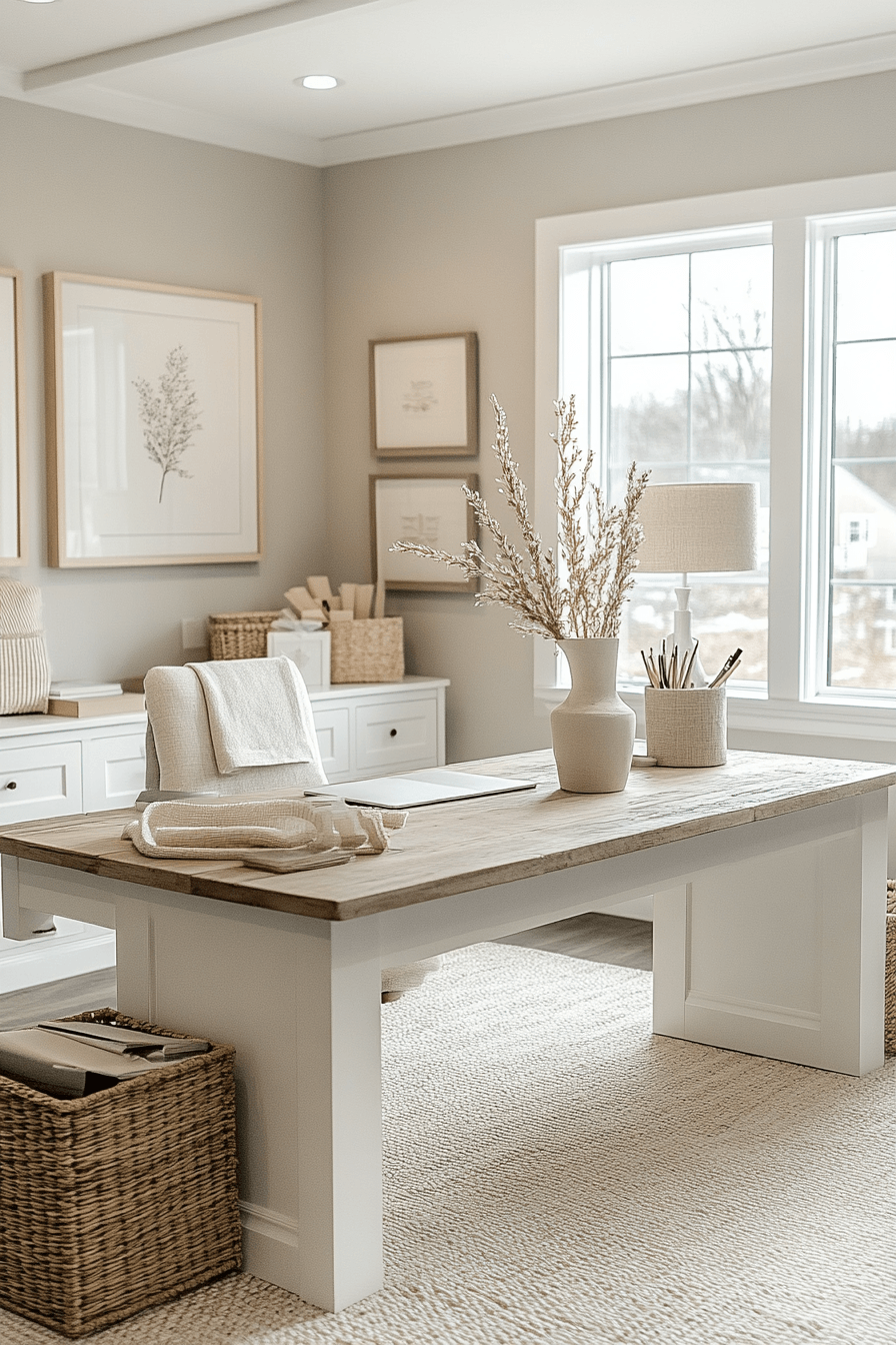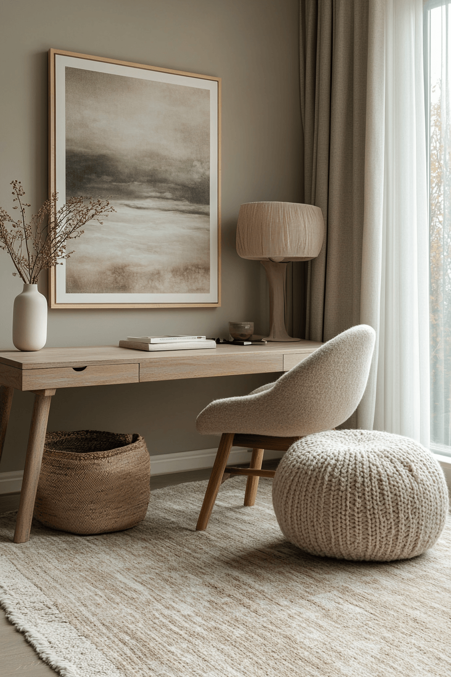 Serene productivity haven is one of the most effective calming office decor styles for creating a focused yet peaceful workspace that feels easy to settle into. Soft neutral tones like warm whites, light taupes, and gentle greys instantly reduce visual noise and help the mind stay clear. The desk layout feels open and intentional, with only essential items like a laptop, notebook, and a few curated accessories in view. Materials like light wood, linen, and matte finishes add subtle warmth while maintaining a clean, modern aesthetic. Thoughtful storage solutions keep clutter out of sight, reinforcing the calm environment. The mood is balanced, airy, and quietly motivating, making it ideal for sustained productivity. Click to uncover more calming workspace inspiration.