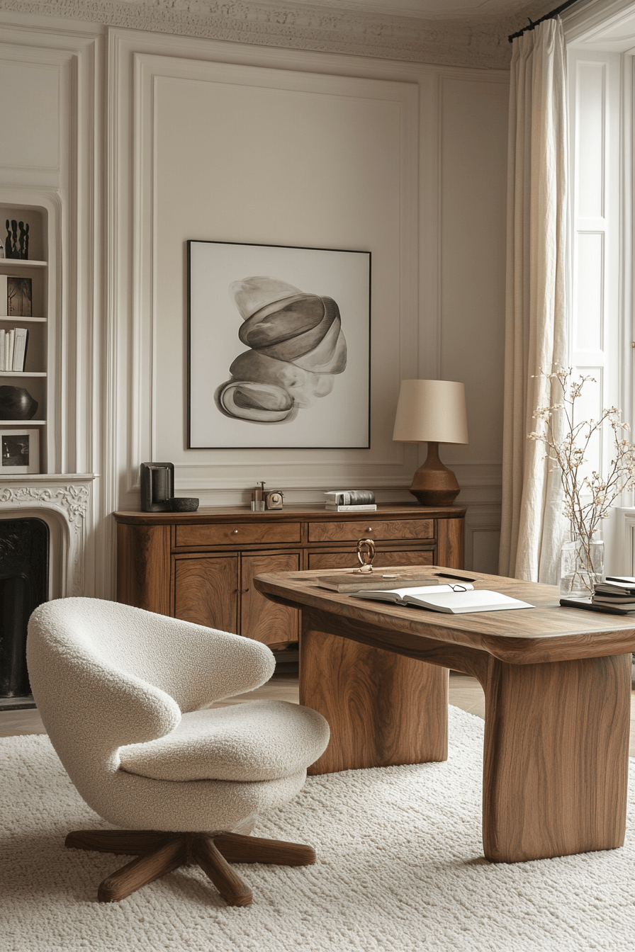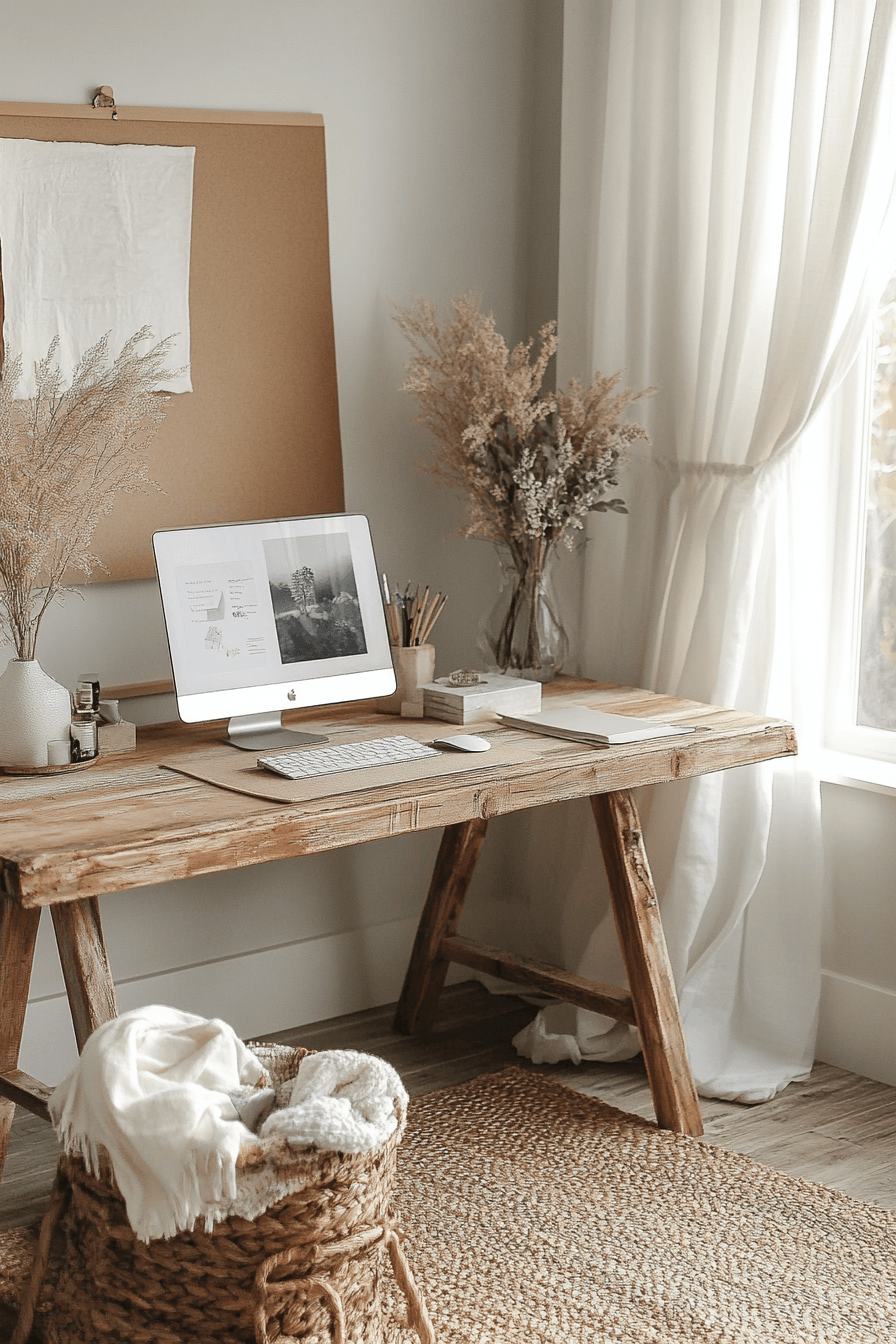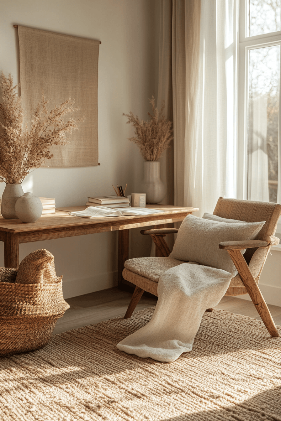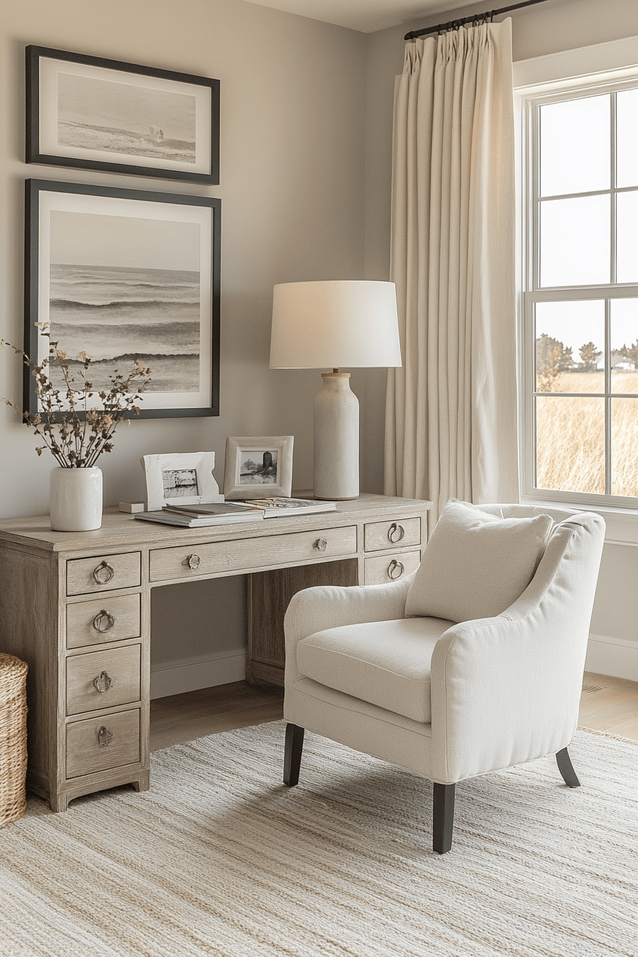 Serene productivity haven is one of the most effective calming office decor styles for creating a focused yet peaceful workspace that feels easy to settle into. Soft neutral tones like warm whites, light taupes, and gentle greys instantly reduce visual noise and help the mind stay clear. The desk layout feels open and intentional, with only essential items like a laptop, notebook, and a few curated accessories in view. Materials like light wood, linen, and matte finishes add subtle warmth while maintaining a clean, modern aesthetic. Thoughtful storage solutions keep clutter out of sight, reinforcing the calm environment. The mood is balanced, airy, and quietly motivating, making it ideal for sustained productivity. Click to uncover more calming workspace inspiration.