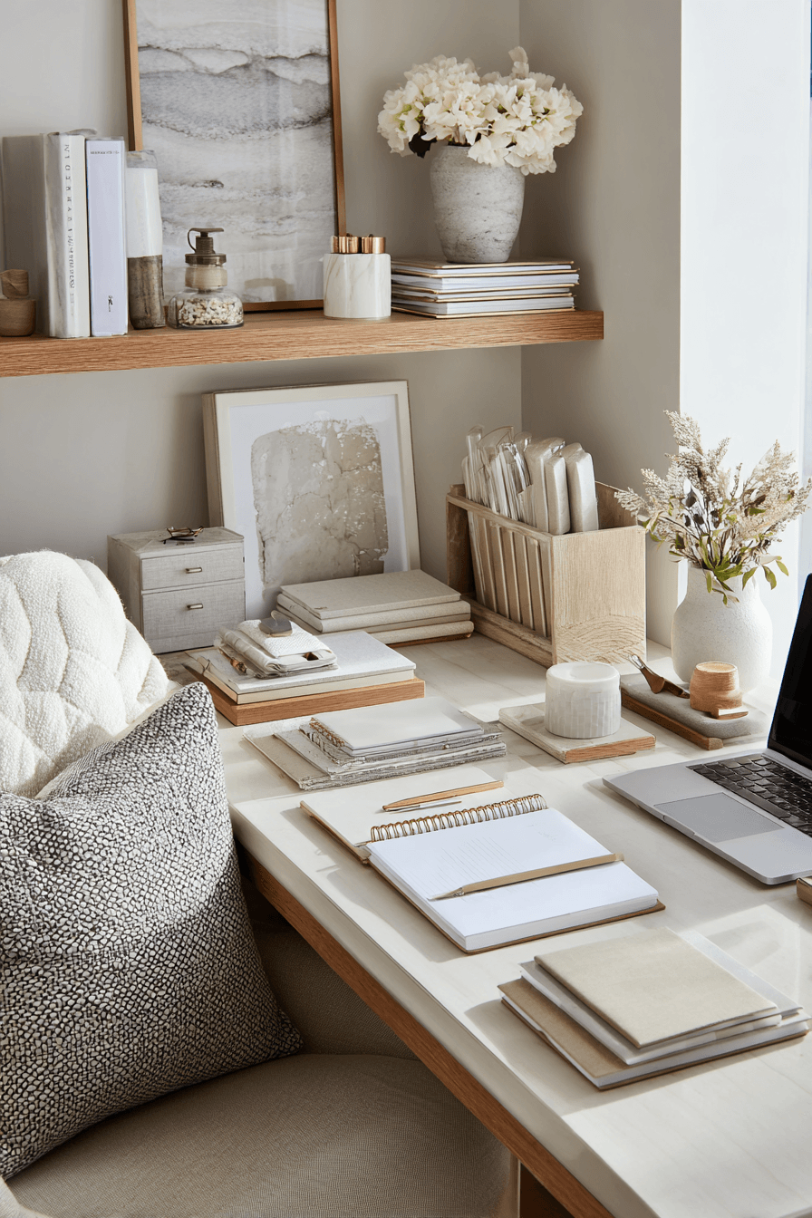 A peaceful planning zone is designed for clarity and calm within calming office decor, making it ideal for organizing tasks and staying on track. A clean desk paired with thoughtful organization systems like trays, notebooks, or planners supports productivity without overwhelm. Soft tones such as ivory, pale grey, and muted beige keep the space visually light and stress-free. The layout prioritizes accessibility, ensuring everything has a designated place. Materials like wood, fabric, and paper textures add comfort and a tactile sense of calm. The mood feels structured yet relaxing, helping you plan with ease and clarity. Tap to explore more organized workspace ideas.