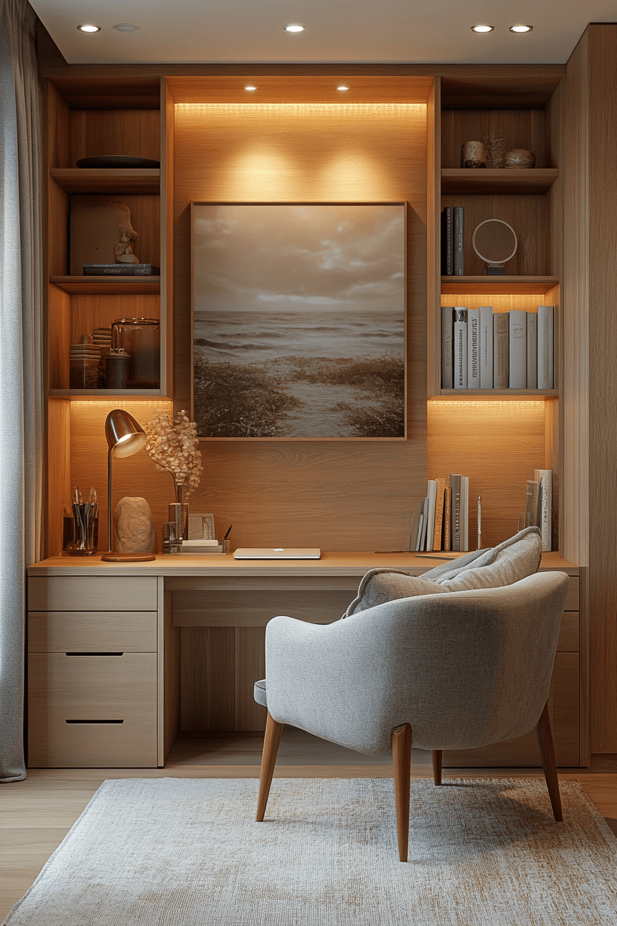 A restful work niche creates a quiet, dedicated space for calming office decor that feels both private and comforting. A compact layout keeps essentials within easy reach, making the area efficient without feeling cramped. Soft lighting, such as a warm desk lamp or wall sconce, enhances the relaxing atmosphere. Neutral tones combined with cozy textures help the space feel inviting and calm. Materials like wood, fabric, and soft finishes add a sense of warmth and ease. The mood feels tucked-away, peaceful, and perfect for focused work sessions. Tap to explore more niche workspace designs.