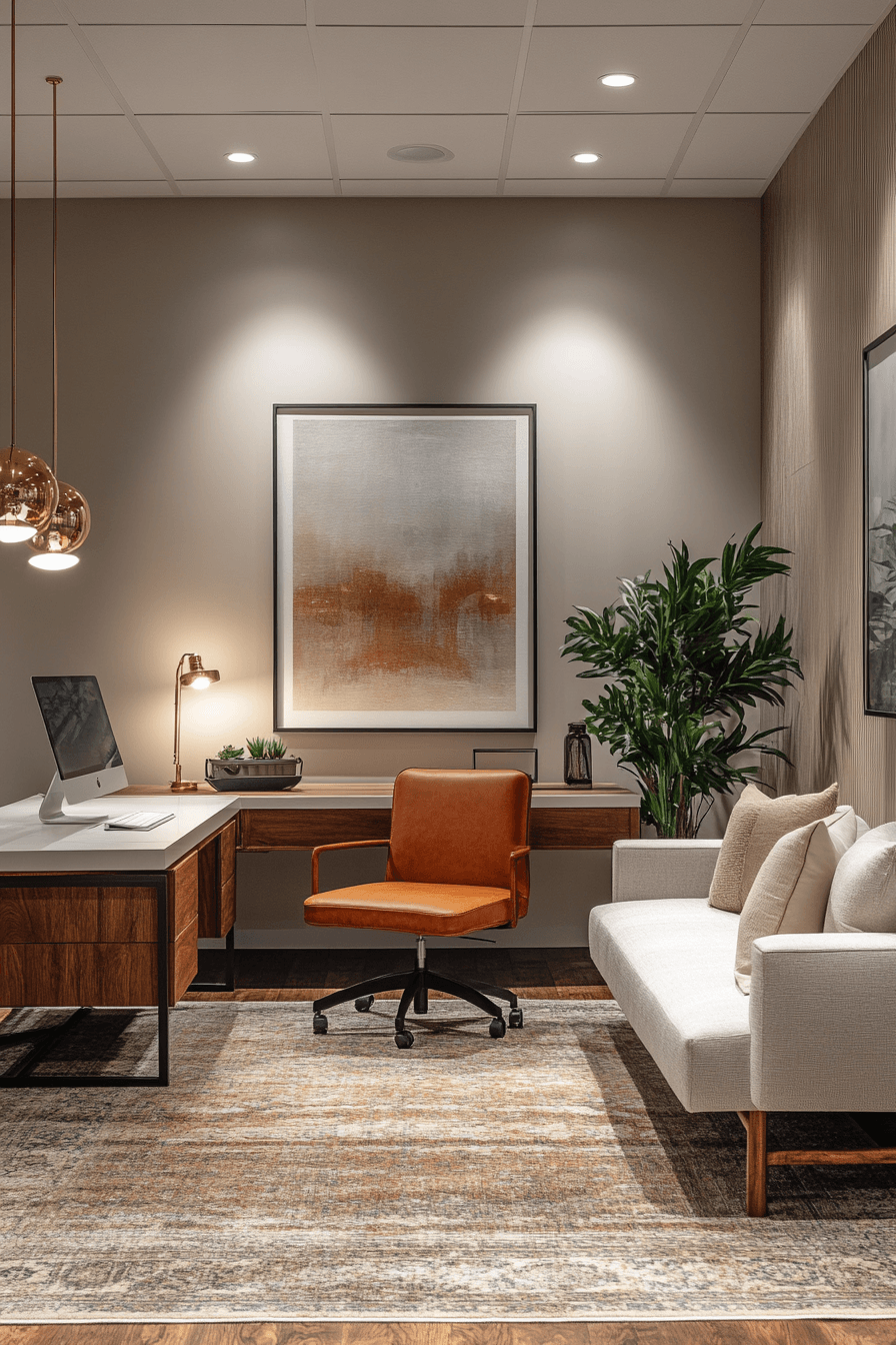 Warm accent office introduces subtle pops of warmth into calming office decor, creating a space that feels both soothing and inviting. Neutral tones form the base, while accents like warm wood, soft terracotta, or muted gold add gentle character. The layout remains clean and uncluttered, allowing the warm elements to enhance rather than overpower the design. Soft textiles like cushions or rugs bring additional comfort and depth. Balanced lighting helps highlight these accents without creating harsh contrasts. The mood is welcoming, softly energized, and ideal for long work sessions. Explore more warm office styles here.