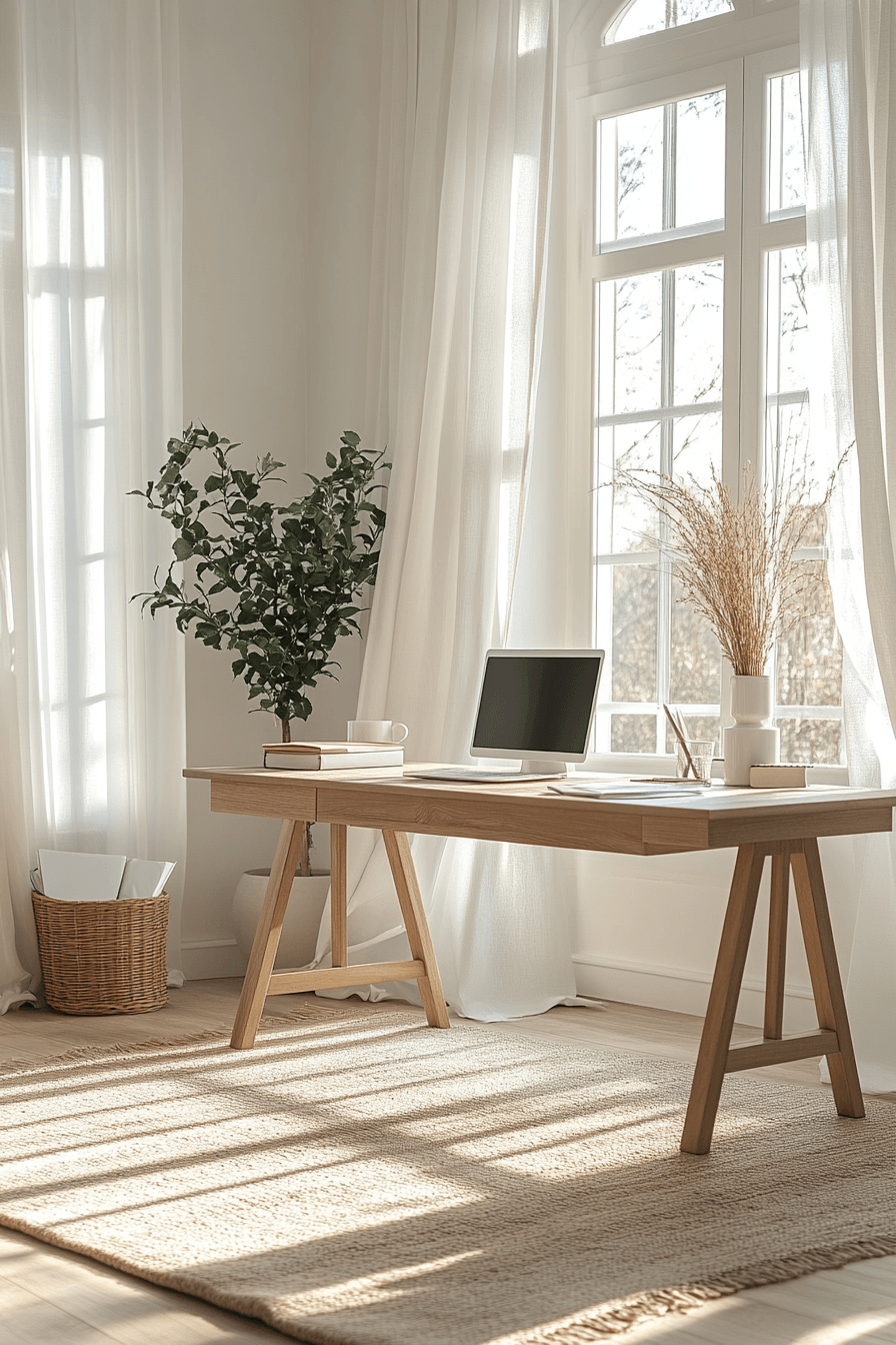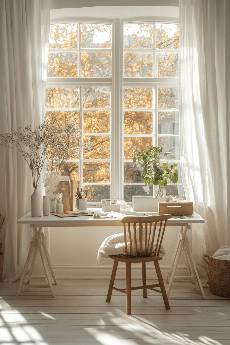 Light-filled workroom maximizes natural brightness for calming office decor that feels fresh, open, and energizing. Large windows or sheer curtains allow sunlight to fill the space, creating a naturally uplifting environment. The layout stays airy with minimal furniture, open surfaces, and plenty of breathing room. Light woods, white finishes, and soft fabrics reflect brightness, enhancing the overall glow of the room. Strategic placement of mirrors or glossy surfaces can further amplify the light. The mood is bright, refreshing, and peacefully productive throughout the day. Discover more bright workspace ideas here.