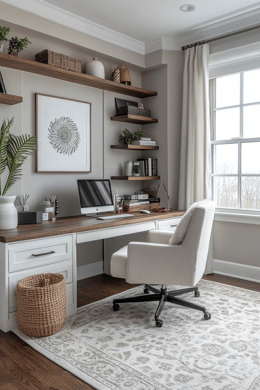 A gentle focus retreat creates a soft, distraction-free environment perfect for calming office decor that supports deep concentration. Muted tones like dusty beige, pale grey, and soft blush help the space feel visually quiet and cohesive. The layout keeps the desk area streamlined and organized, with clean lines and minimal accessories. Subtle accents like a plush rug, a warm-toned desk lamp, or a soft cushion add comfort without cluttering the space. Natural light or soft ambient lighting enhances the calm ambiance throughout the day. The mood feels cozy, calm, and effortlessly productive. Explore more serene office setups here.