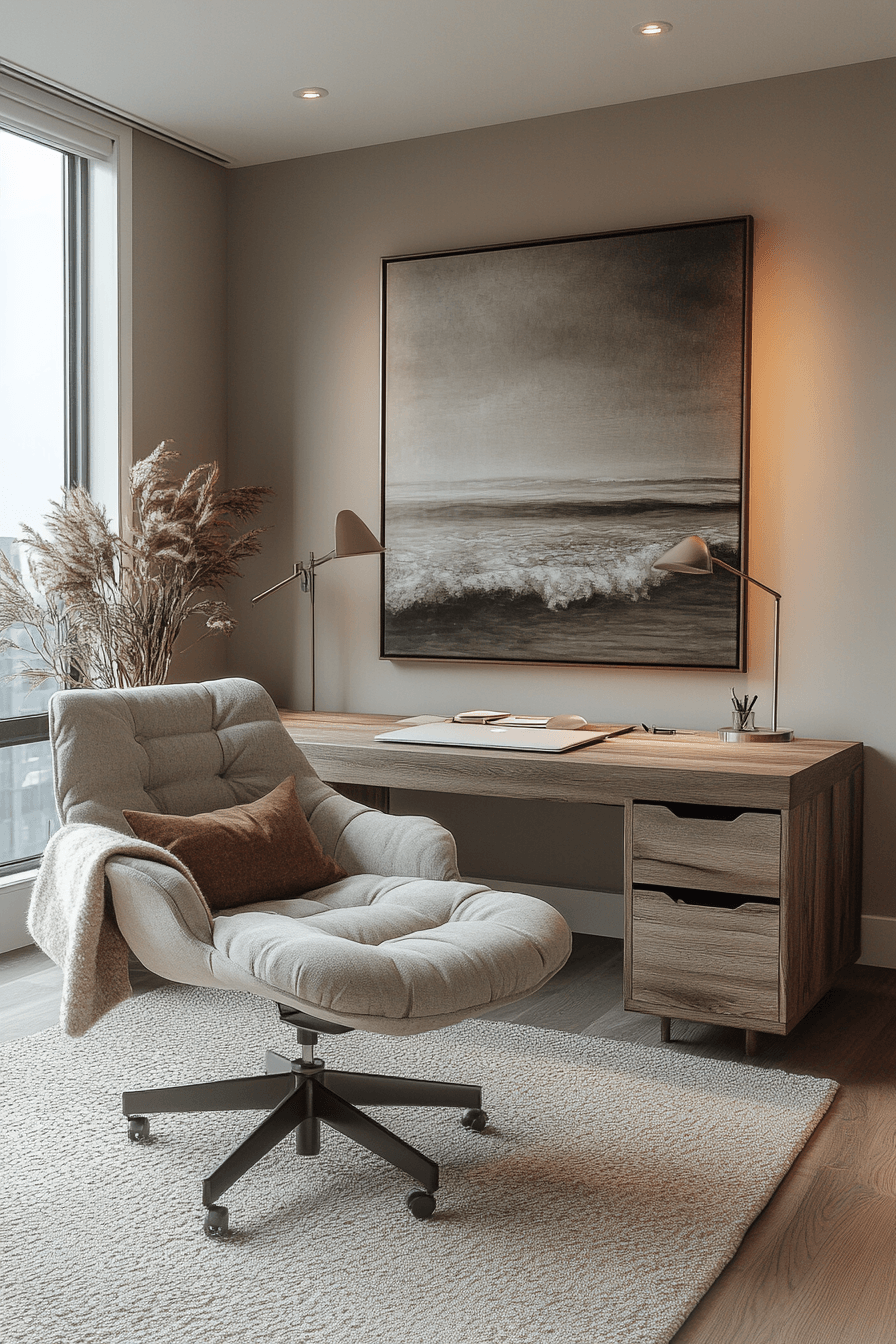 An elevated calm workspace brings subtle luxury into calming office decor without overwhelming the simplicity of the design. High-quality materials like smooth wood, soft upholstery, and refined finishes create a polished look. The layout stays uncluttered, allowing each element to feel intentional and well-placed. Layered textures add depth while maintaining a sense of calm and cohesion. Soft lighting enhances the materials and creates a warm, refined glow. The mood feels sophisticated, relaxing, and quietly inspiring for daily work. Click to explore more elevated workspace ideas.