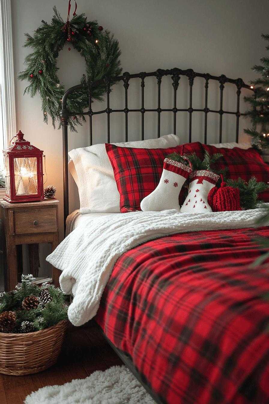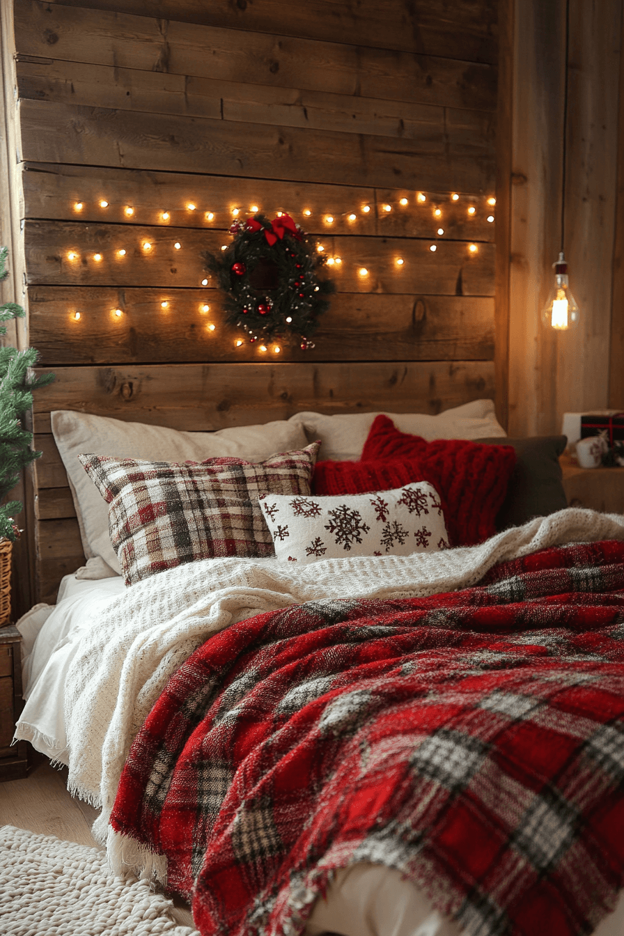 Play with bold patterns in a Christmas bedroom alive with tartan, checks, and layered textures. Wooden décor, vintage lanterns, and flannel bedding set a nostalgic tone. Add pinecones or red ribbons for a final touch. The room radiates character and personality.