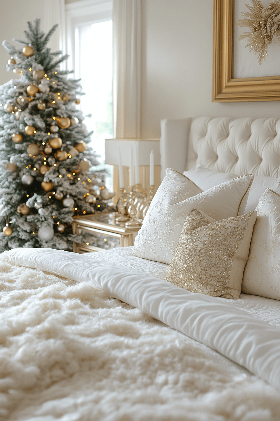 Gold satin, champagne lights, and crisp linens create a Christmas bedroom of refined radiance. A soft white tree shimmers in the corner, adding balance to the glow. Every reflection feels soft, romantic, and tranquil. This design whispers grace instead of shouting glitter.