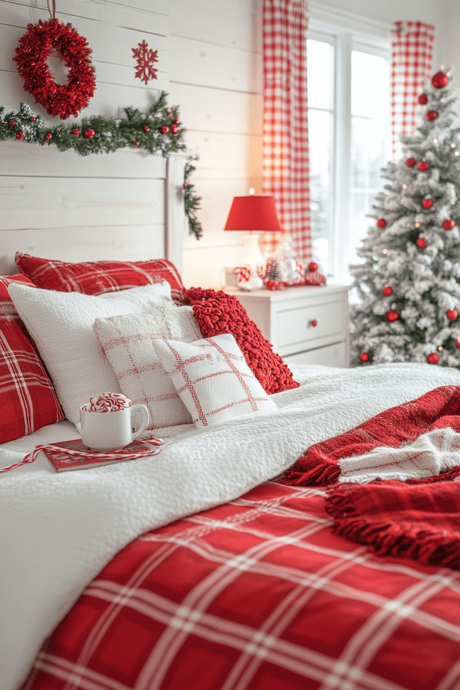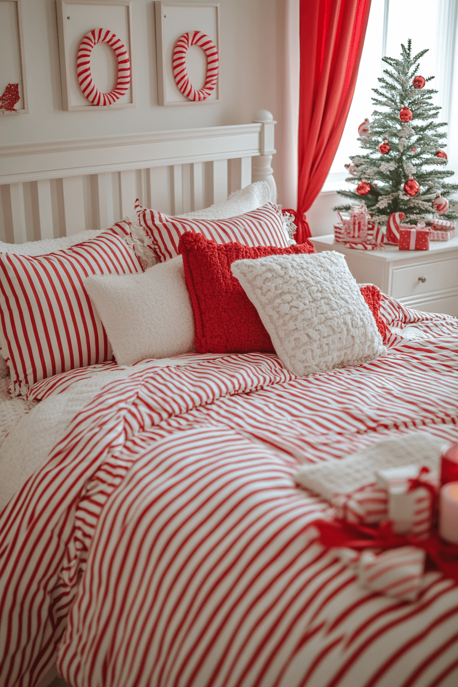 Peppermint hues and playful textures bring bright cheer to your Christmas bedroom. Red-striped pillows, snowflake garlands, and candy-cane candles make the space pop with fun. Keep your backdrop white so every detail shines. The result is sweet, spirited, and joyfully nostalgic.