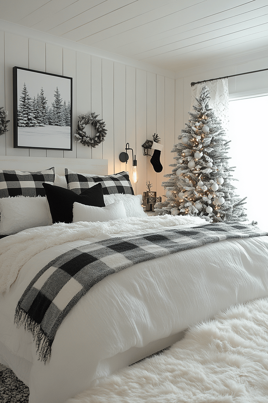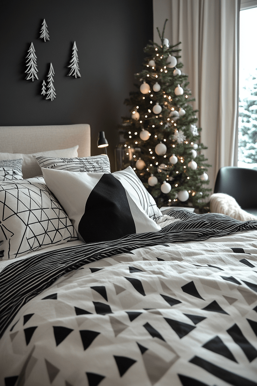 Make modern magic in a Christmas bedroom that thrives on contrast. Crisp black, white, and gray accents keep it fresh while metallic trim adds elegance. Smooth lines meet plush textures for balance. The result is sleek yet soulful.