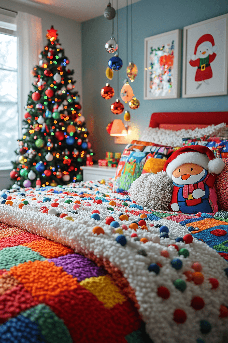 Whimsy and color dance together in your Christmas bedroom through pastel garlands and playful ornaments. A soft pink throw or mint pillow adds charm without chaos. Twinkle lights tie it all together with subtle joy. It’s lighthearted, sweet, and endlessly uplifting.