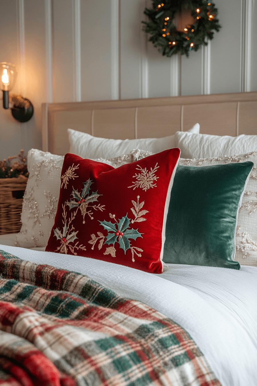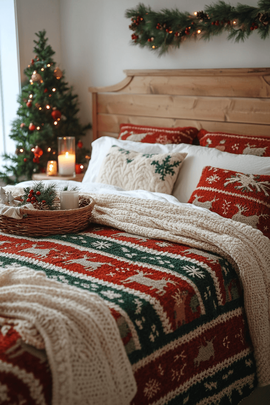 Add personality fast with patterned pillows and a signature holiday throw. Play with color, typography, or faux-fur texture. The mix keeps your Christmas bedroom fresh without effort. It’s decor made for joy.