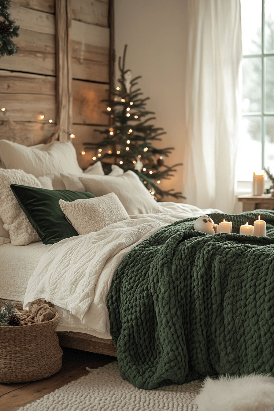 Celebrate texture with velvety cushions, woven blankets, and cozy knits in your Christmas bedroom. Keep the color palette tight—earthy and rich—to highlight dimension. Every material feels inviting and warm to the touch. It’s tactile heaven.