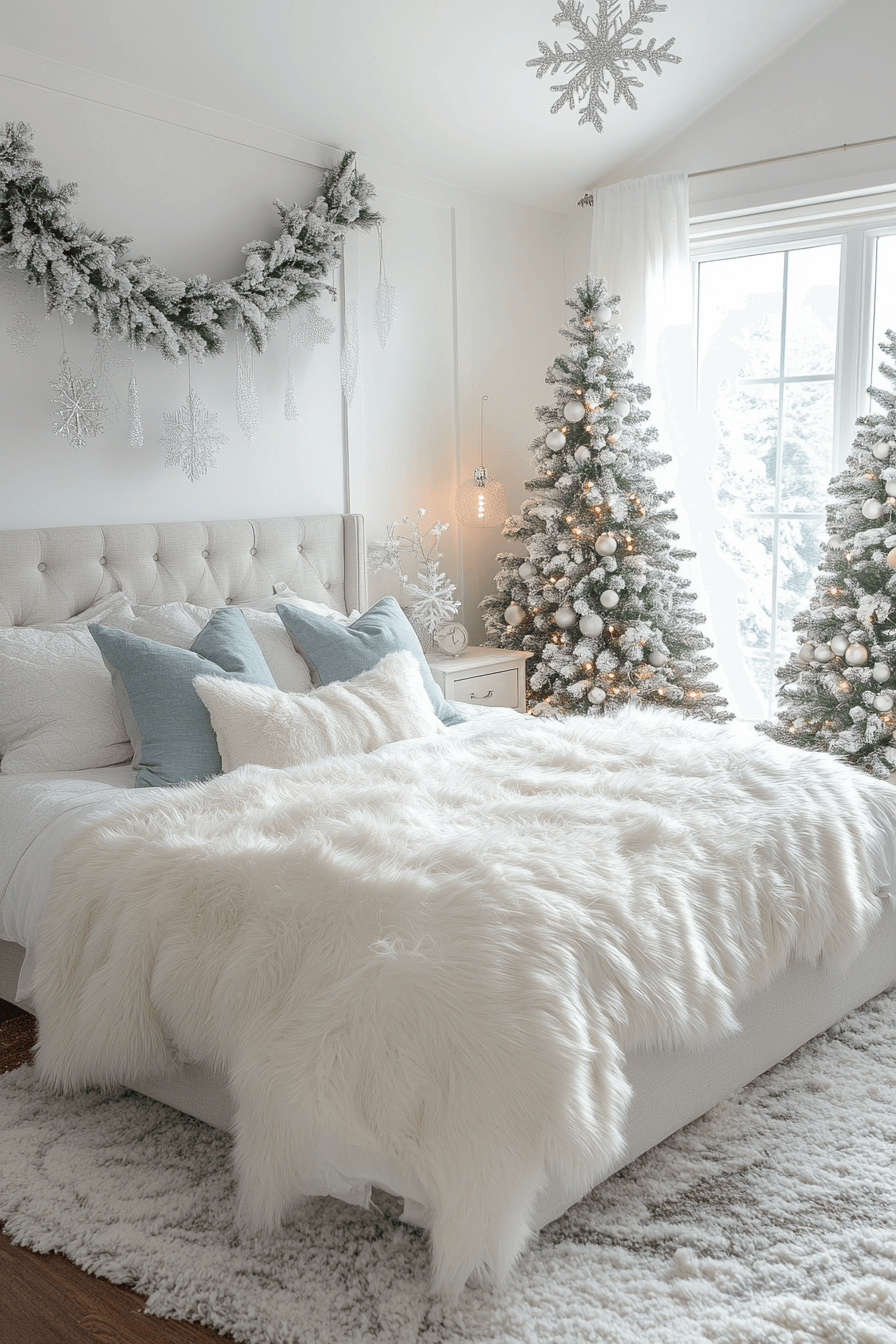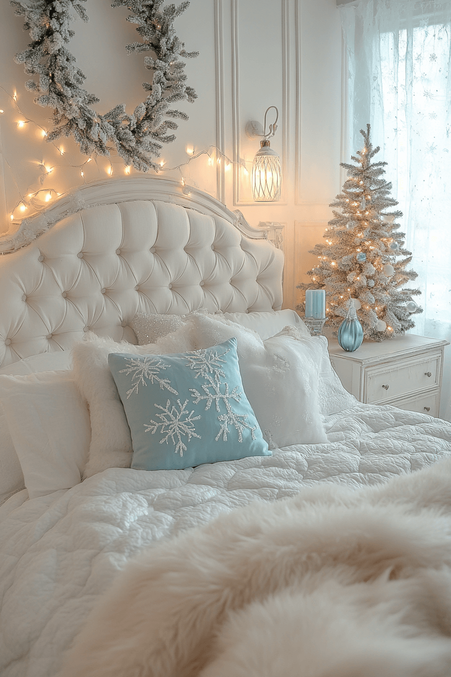 Cool whites, crystal accents, and sheer drapes transform your Christmas bedroom into a wintry dreamscape. A silver garland reflects candlelight while frost-blue ornaments add delicate glimmer. Everything feels ethereal, like waking up inside a snow globe. The stillness brings peace that lasts beyond the holidays.