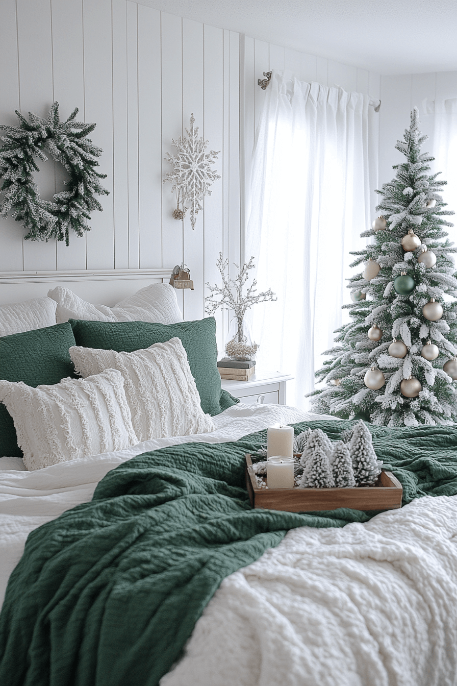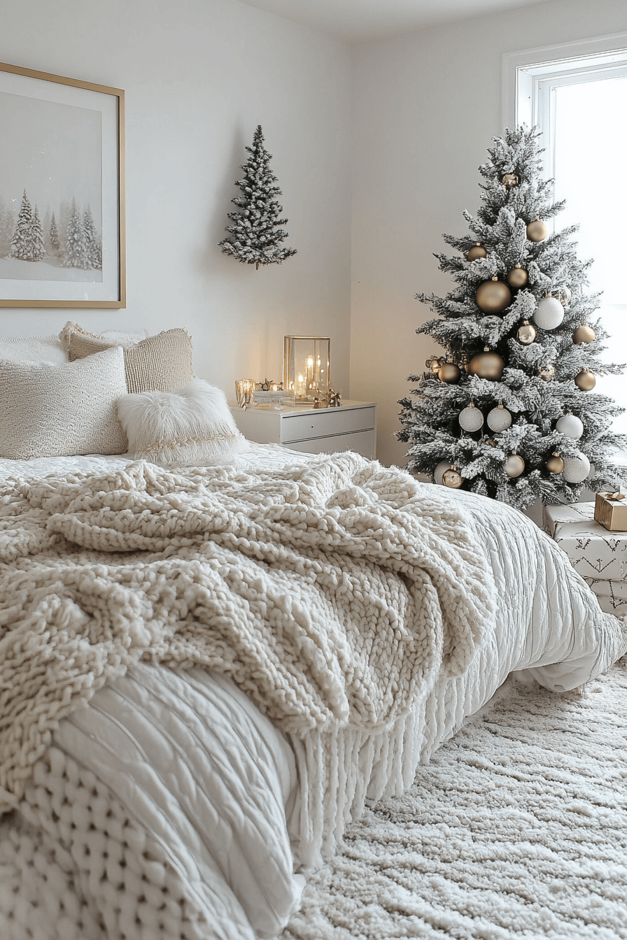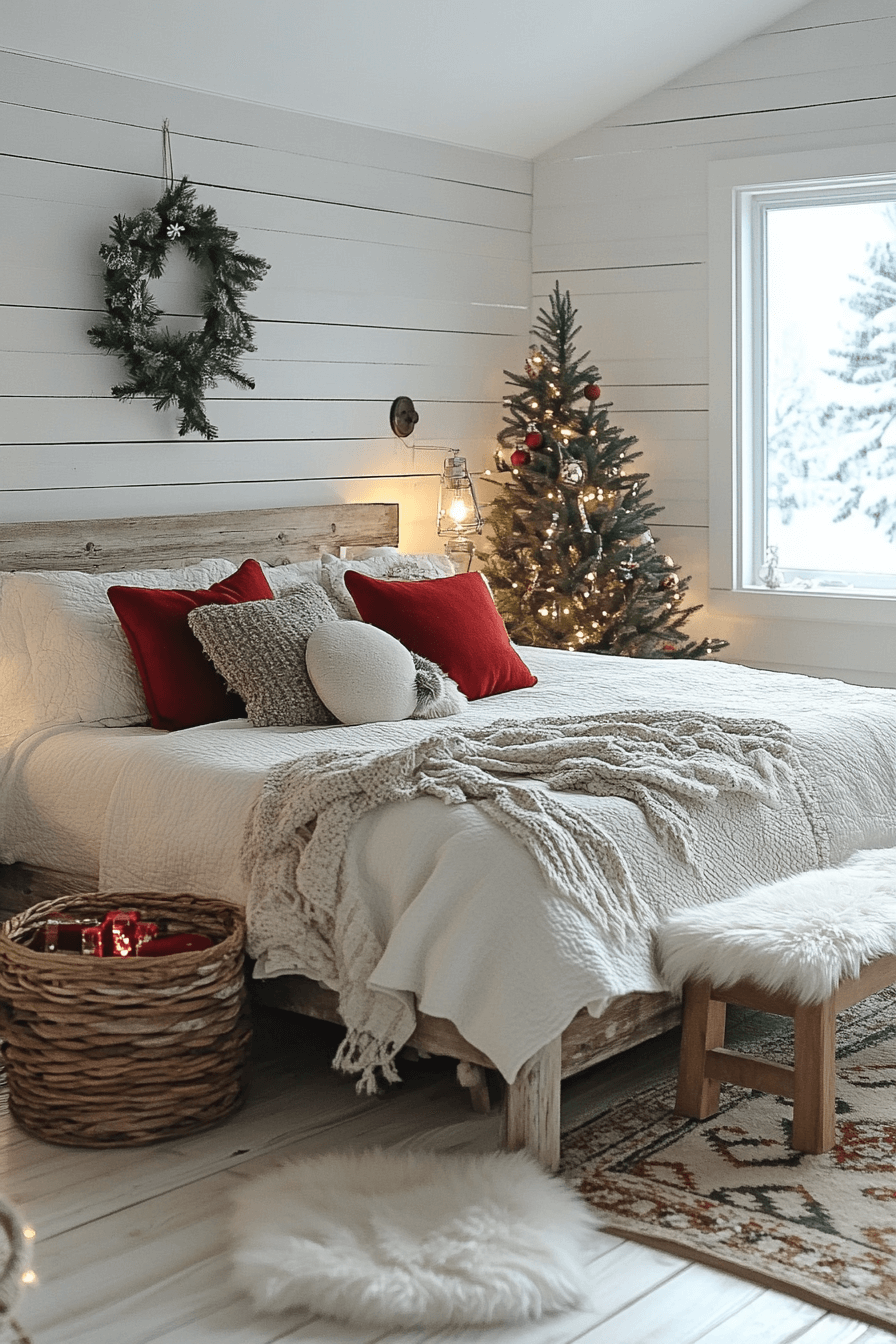Wrap your Christmas bedroom in tonal whites and pale grays for a scene that feels kissed by snow. Add texture through wool blankets, woven baskets, and delicate frosted ornaments. Soft lighting keeps the room dreamy from dawn till dusk. Every detail whispers calm, fresh air, and winter comfort.
