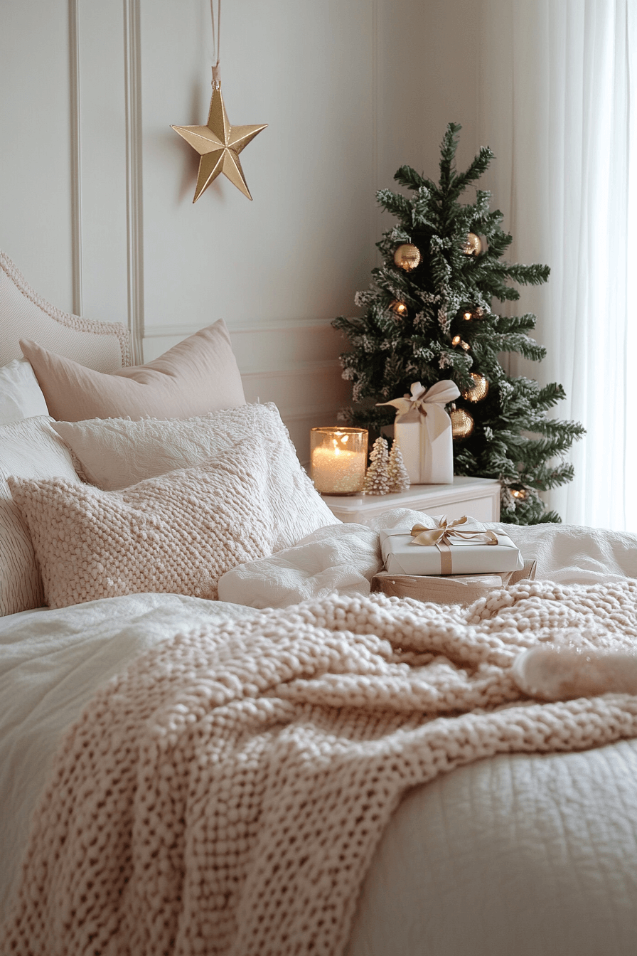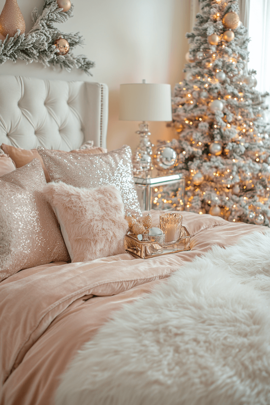 Infuse old-Hollywood allure into your Christmas bedroom with deep velvet, mirrored trays, and gold sparkle. Dim lights shimmer across soft fabrics, creating an inviting cinematic glow. Touches of blush or bronze elevate the palette into modern opulence. Every night feels like a red-carpet retreat.