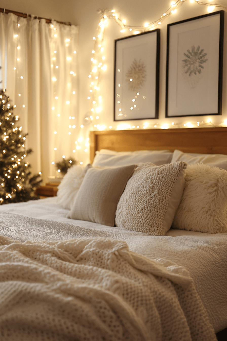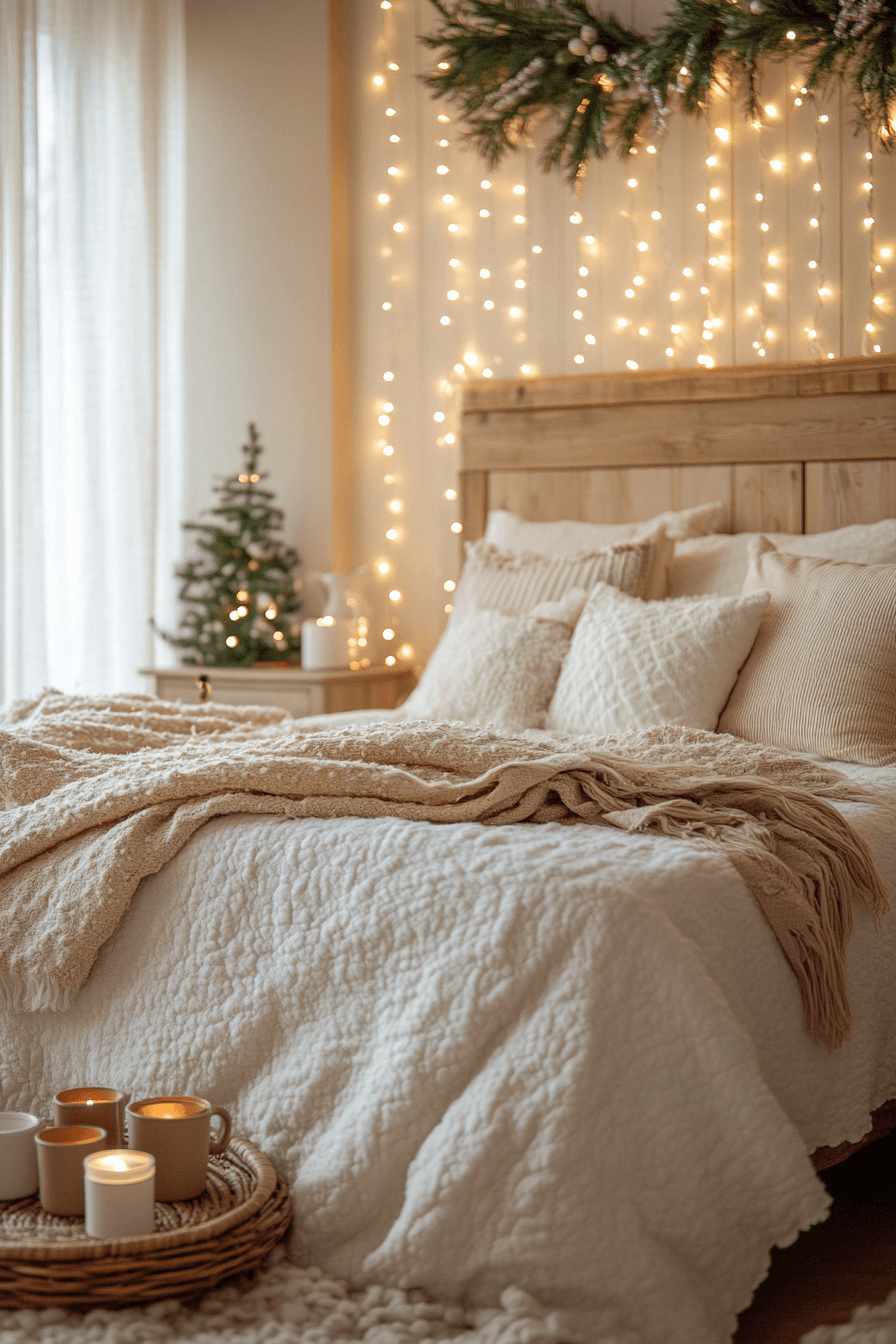 Lights wrapped around the bedframe cast a gentle halo across your Christmas bedroom. Add a mirrored tray of candles for layered shimmer. Each glow bounces softly against plush pillows and linen sheets. It’s the perfect formula for dreamy nights.
