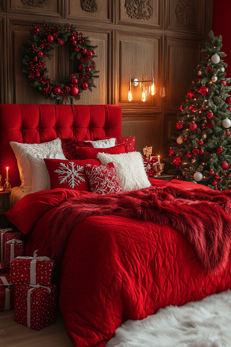 Scarlet bedding, gold ribbon, and glowing candles bring a regal touch to your Christmas bedroom. Add mirrored frames or crystal garlands for light play. It’s the perfect mix of passion and polish. Every glance feels celebratory.