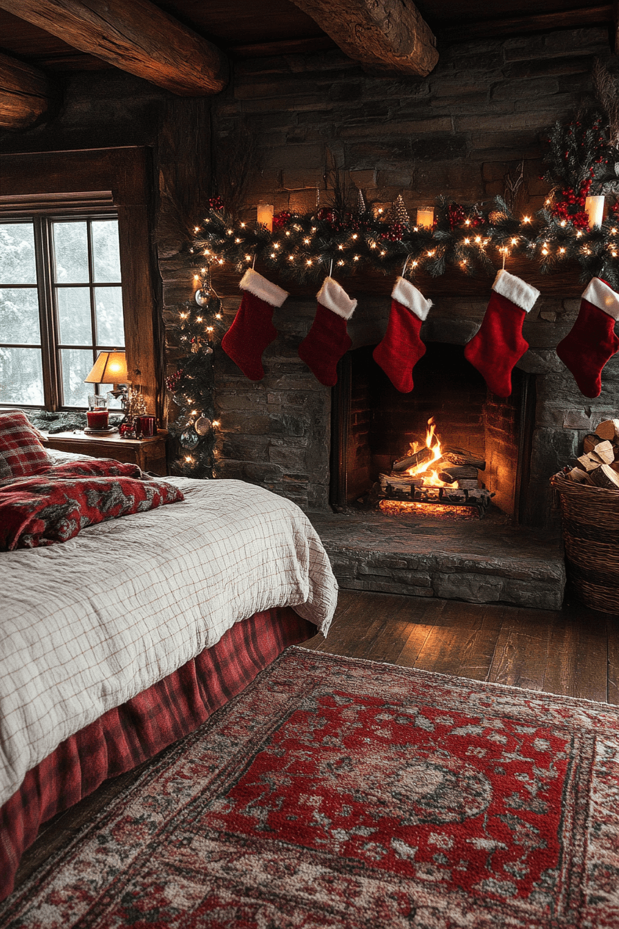 Create a fireside illusion with amber fairy lights, cinnamon candles, and rustic wood touches. The warmth wraps your Christmas bedroom in glow. Even without a fireplace, the vibe feels authentic. You’ll crave early nights.