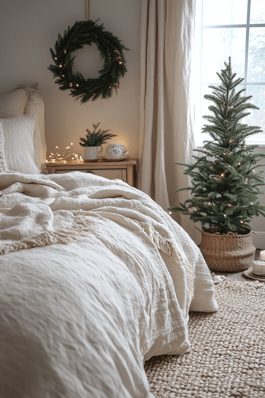 Capture the charm of Scandinavian minimalism in your Christmas bedroom through natural materials and cozy restraint. Layer oatmeal linens, white candles, and unfinished wood accents for that authentic Nordic warmth. A small tree in a woven basket adds life without clutter. The entire space hums with quiet elegance.