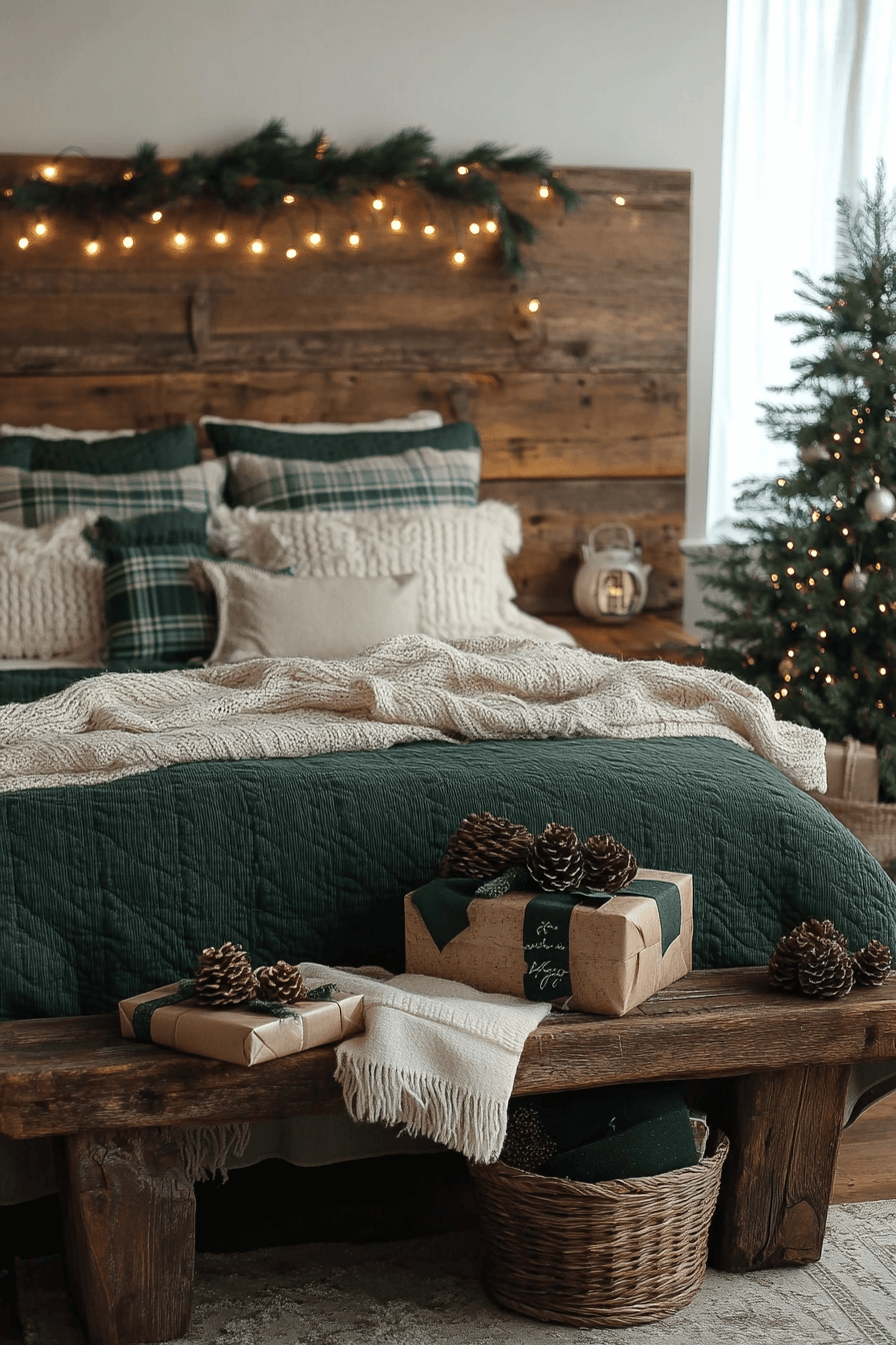 Blend reclaimed wood with sleek bedding for a Christmas bedroom that balances rustic charm and modern polish. A plaid blanket draped over the footboard grounds the space. Simple greenery and matte ornaments tie the look together. It’s cozy yet elevated, natural yet curated.