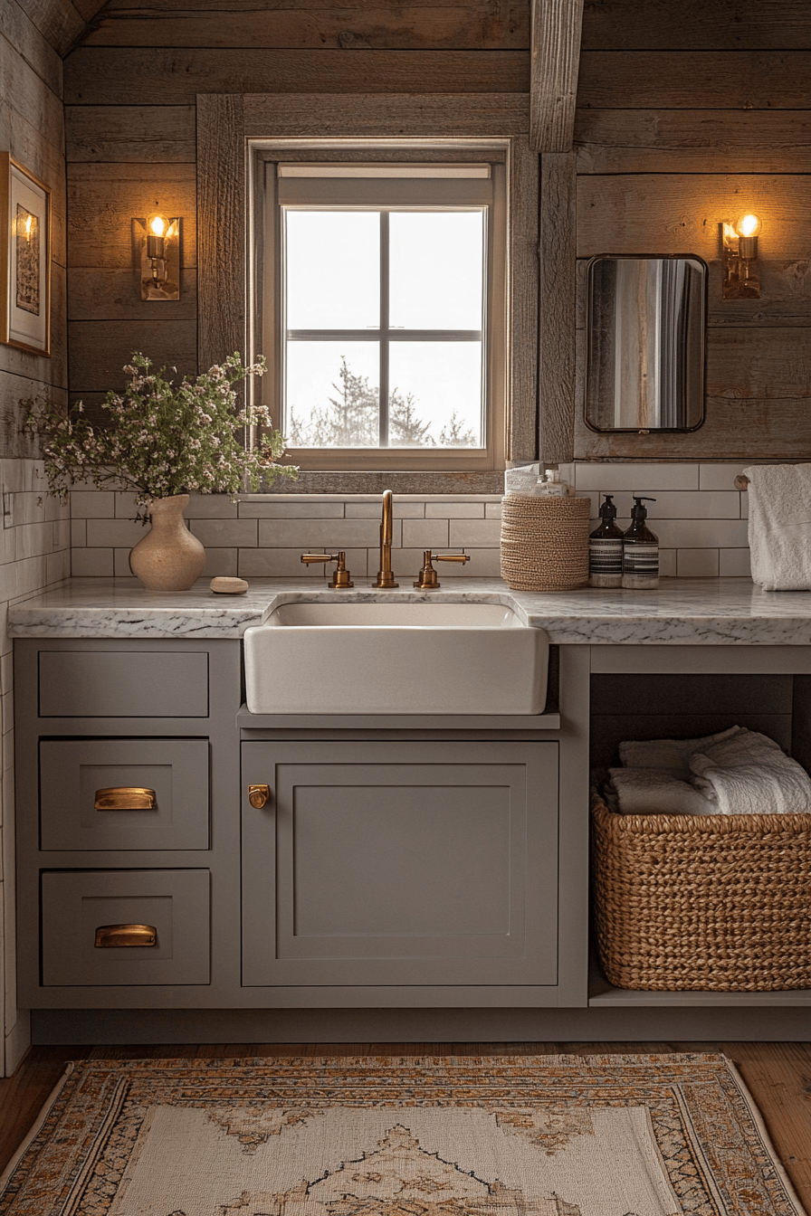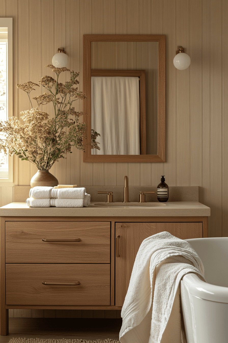 Golden, honey-toned finishes bring a natural glow that instantly elevates a cozy bathroom. Whether through wood cabinetry or warm metallic accents, the effect feels rich and inviting. Paired with soft lighting and creamy walls, the space becomes warm and enveloping. Adding texture keeps everything feeling grounded and not overly polished. The warmth creates a welcoming atmosphere you’ll enjoy every day. Click to uncover more warm-toned bathroom ideas.