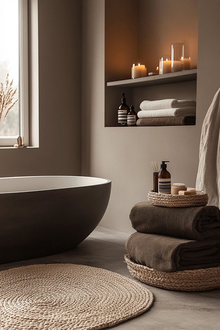 Rich, deep hues paired with plush textures create a cozy bathroom that feels both luxurious and comforting. Warm browns, soft taupes, and layered fabrics invite you to slow down and relax. The softness of textiles balances beautifully against sleek fixtures and clean lines. Warm lighting enhances the depth of the colors and adds a gentle glow. The entire space feels indulgent without losing its inviting charm. Tap to bring this rich and cozy style into your bathroom.