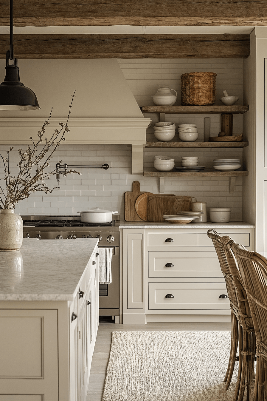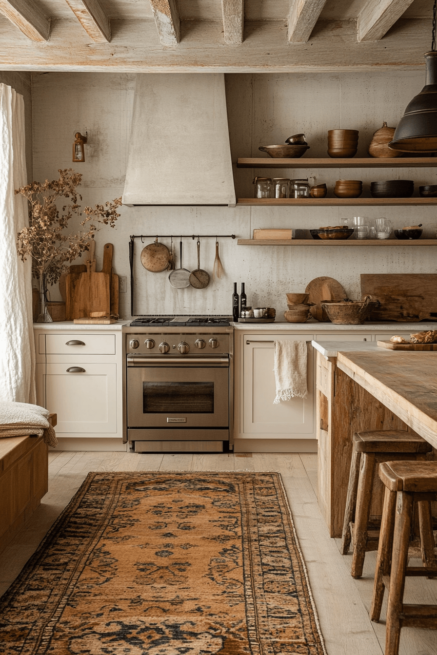 Creamy tones create a cozy kitchen that feels bright, soft, and uplifting all at once. Shades of white and cream blend seamlessly with stone surfaces and light wood accents. Textured rugs and warm lighting prevent the space from feeling too minimal or cold. This approach works especially well in smaller kitchens that need a boost of brightness. The overall effect is a gentle glow that feels welcoming throughout the day. Click to discover how to style this creamy modern look.