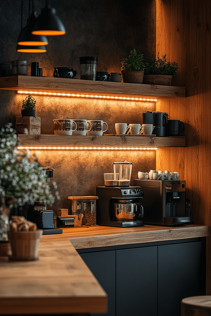 A dedicated coffee corner adds instant charm and personality to a cozy kitchen you’ll love using every day. Wooden shelves, favorite mugs, and soft lighting create a warm and inviting little ritual space. Even a small setup can make mornings feel more special and intentional. The added warmth blends seamlessly into the rest of the kitchen without cluttering it. It’s a simple upgrade that makes a big emotional impact. Tap to build your own cozy coffee station.