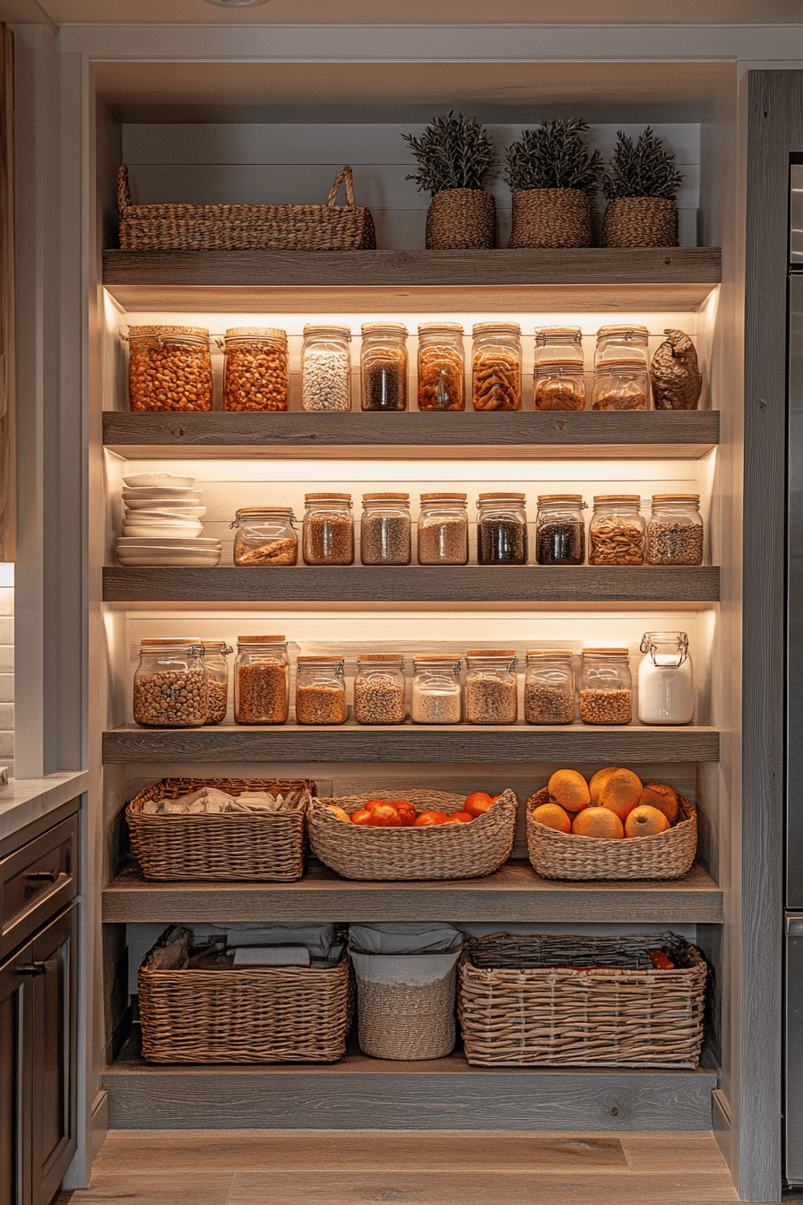 A thoughtfully styled pantry nook brings both beauty and function into a cozy kitchen. Open shelving, glass jars, woven baskets, and warm lighting create a space that feels organized yet full of character. The mix of textures adds depth and visual interest without overwhelming the room. It turns everyday storage into a feature you actually enjoy looking at. Even in smaller kitchens, this detail can make a big difference. Click to elevate your pantry into a cozy focal point.