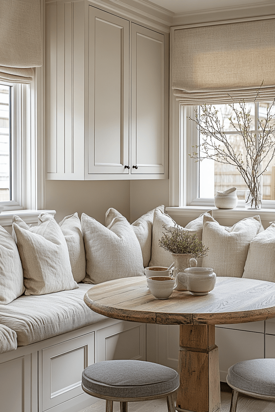 A softly styled breakfast nook adds charm and warmth to a cozy kitchen with its gentle beige tones and inviting textures. Rounded seating and cushioned upholstery create a relaxed spot for slow mornings. Soft lighting enhances the calm atmosphere, making everyday routines feel more special. The light color palette keeps the area feeling open while still cozy. Simple accents like wood bowls or linen curtains add personality without clutter. Click to refresh your breakfast nook with this effortless look.