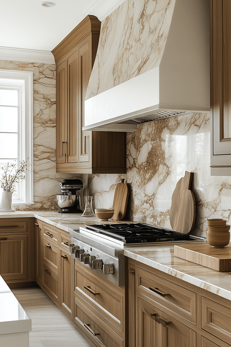 Smooth stone surfaces with subtle veining bring a refined yet cozy kitchen feel that’s both modern and welcoming. A slab backsplash creates a seamless look that feels clean without being cold. When paired with warm cabinetry and soft lighting, the entire space becomes inviting and balanced. The natural patterns in the stone add quiet character without overwhelming the design. It’s an effortless way to introduce elegance into a comfortable setting. Tap to explore beautiful slab backsplash ideas for your kitchen.